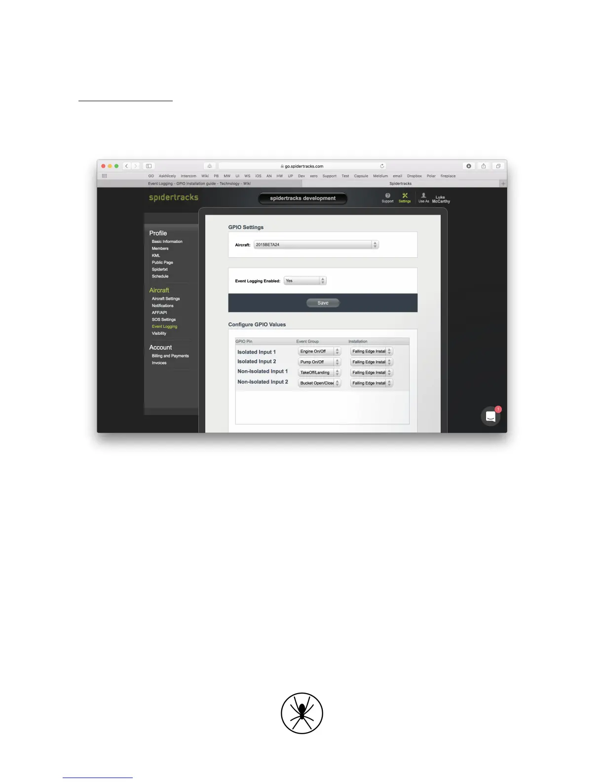 Figure 4. Event Logging and GPIO setup on go.spidertracks.com