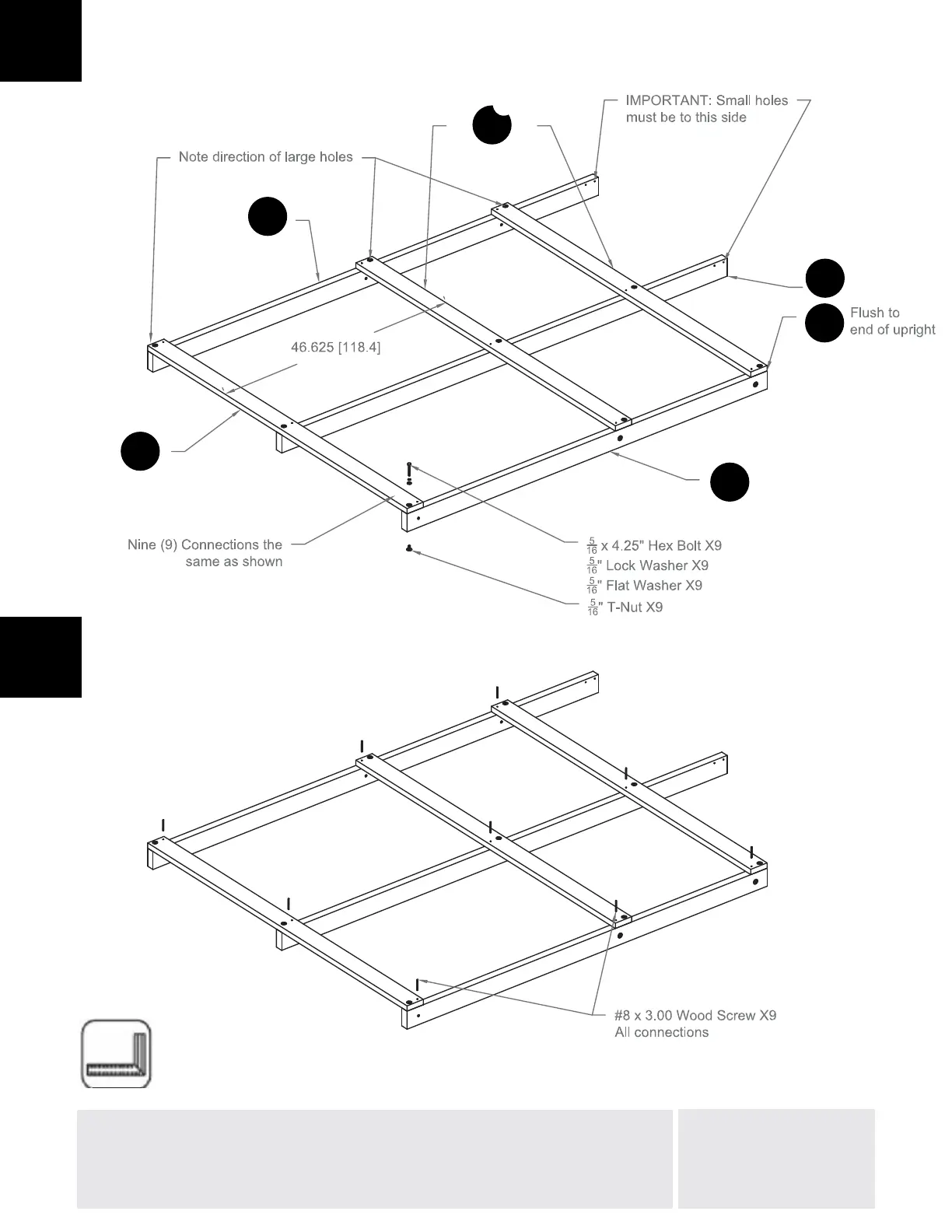 2. IMPORTANT - SEE SMALL HOLE ORIENTATION ON UPRIGHTS.