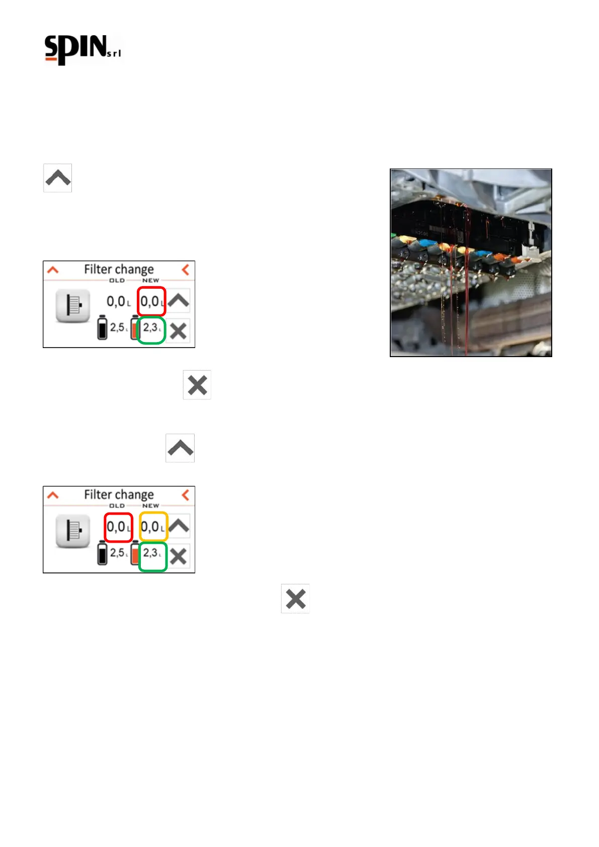 Il quantitativo di olio nuovo inserito è indicato dal campo NEW (in arancione), mentre il campo evidenziato in verde