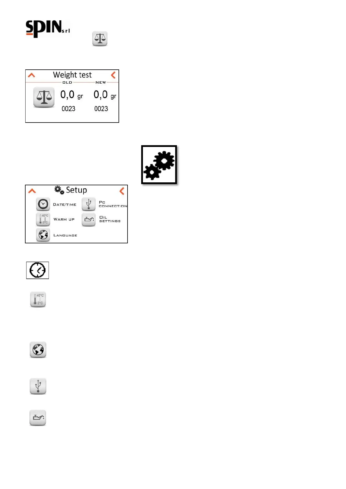 The user can set the density of the oil either new or used by setting the gr./lt. values. In the first page the