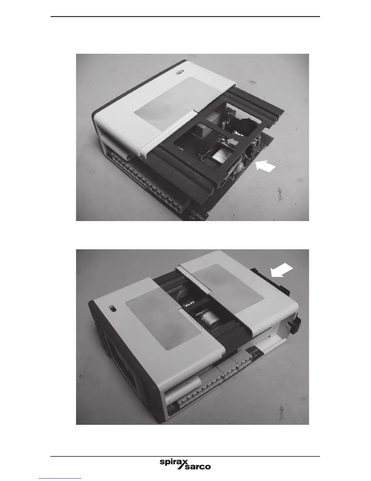 8.3.9 Slide the PCB fully back into position and refit the blue support. Ensure the arrow