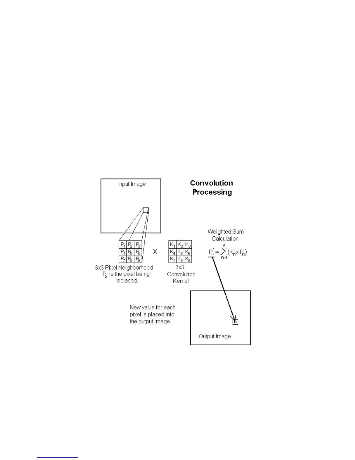 pixels. A similarly dimensioned convolution kernel multiplies each pixel in the neighborhood. The