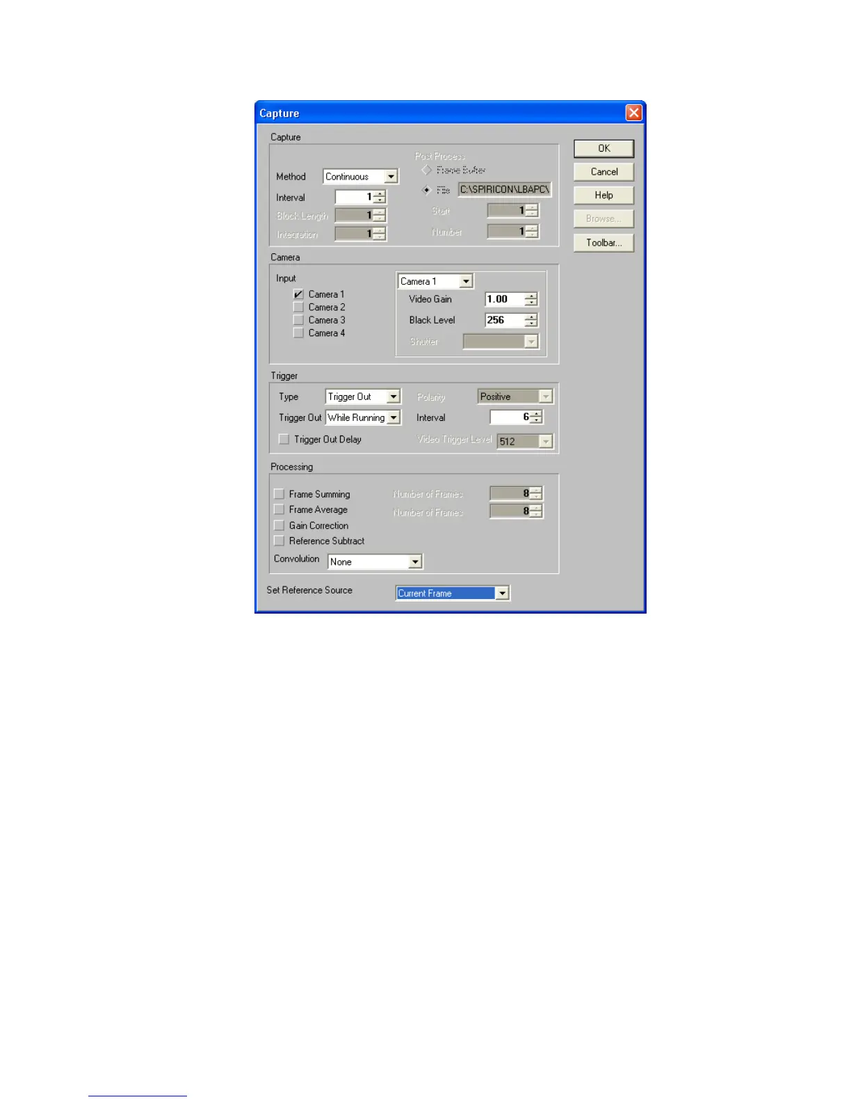 The Capture panel controls how imaged data is to be acquired and saved into the frame buffer.