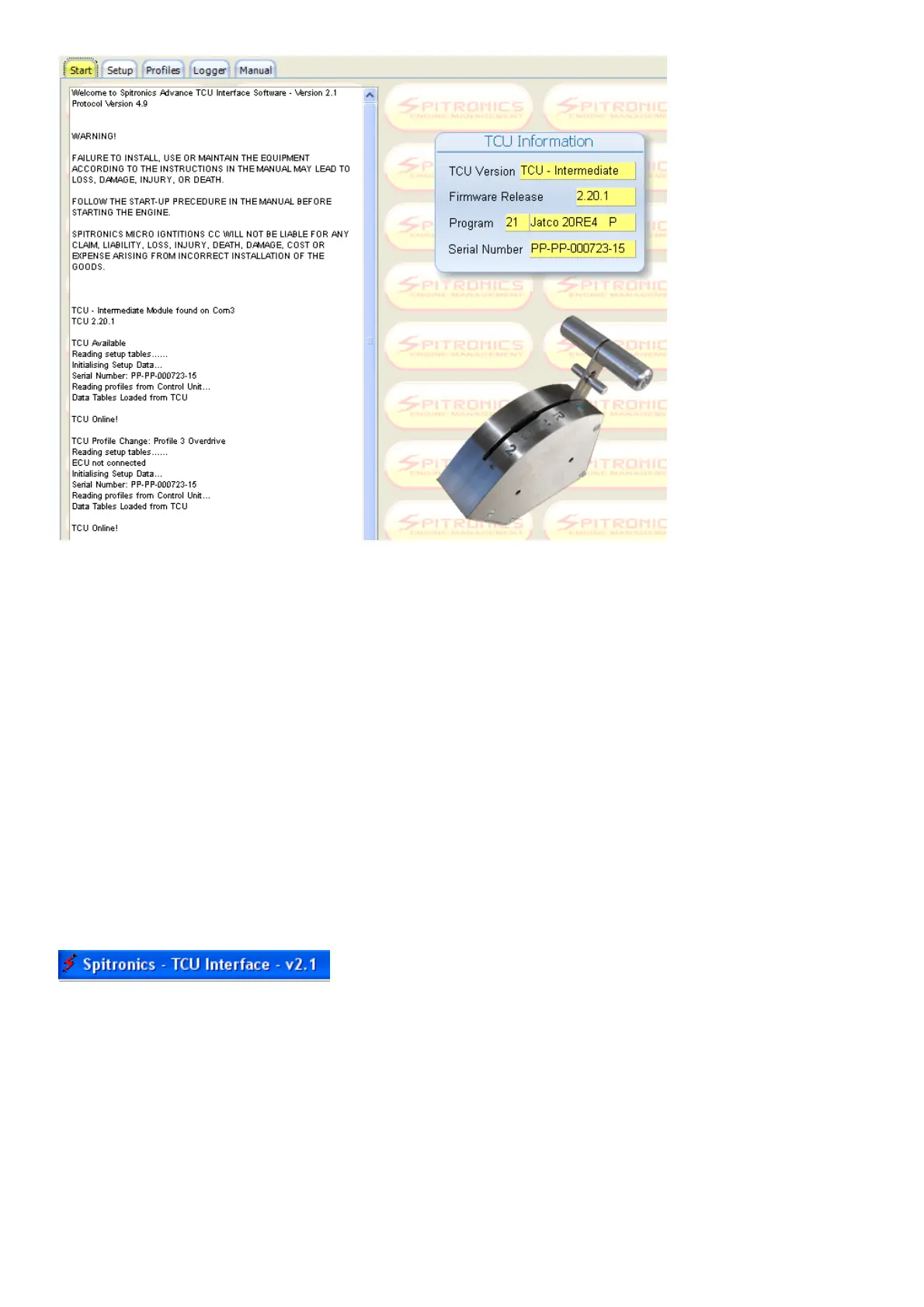 2.20.1.A In the sample means: PC Software Ver. 2, Hardware number 20 (SPITRONICS TCU),