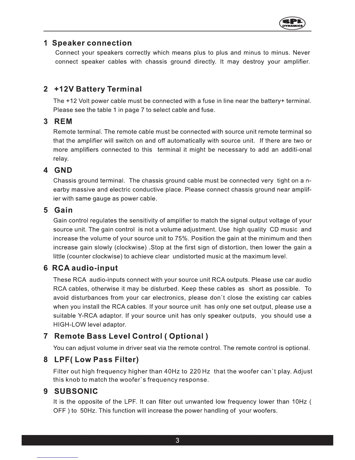 SPL Dynamics ICE-800D - Connections and Controls Overview; Power and Ground Connections; Gain and Filter Adjustments; Speaker Connection