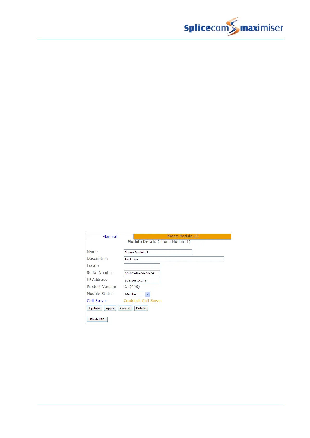 The Flash LED button will instruct the Phone Module’s SpliceCom LED to flash. This feature is useful when