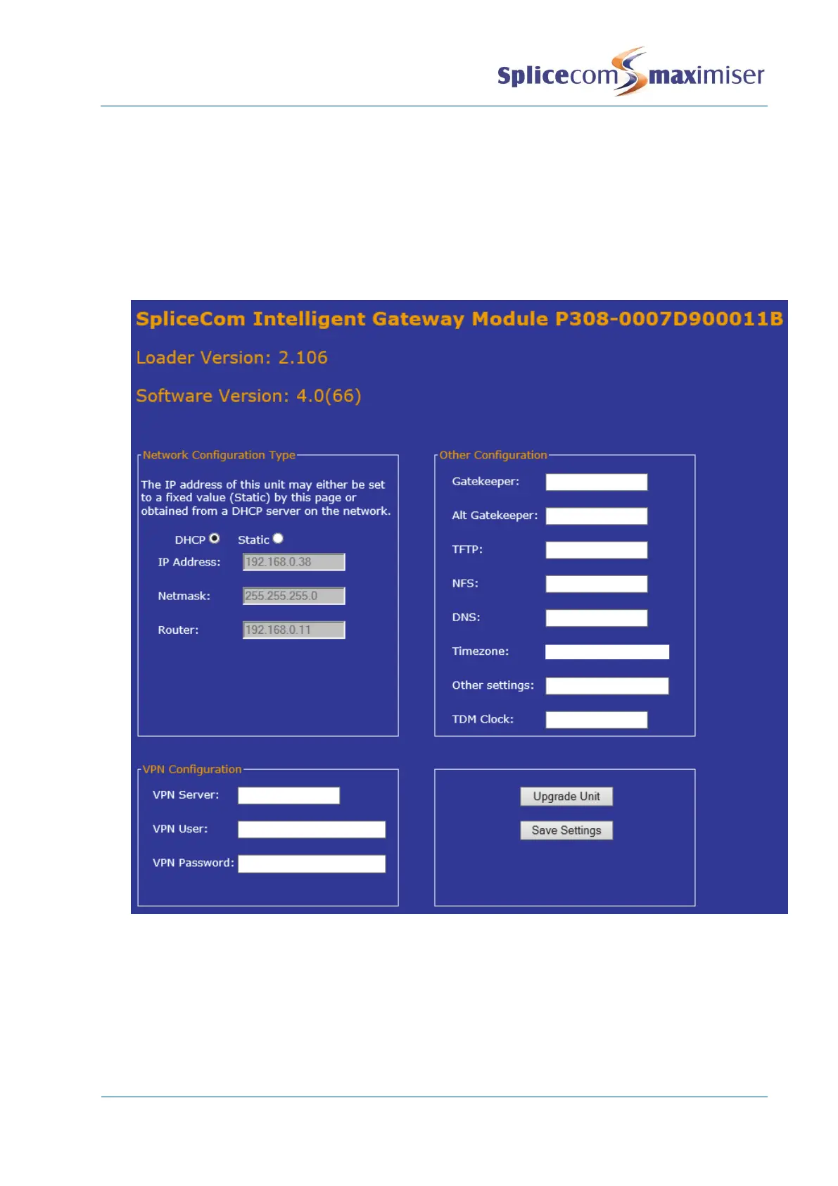 address, together with loader and software version being used by the unit.