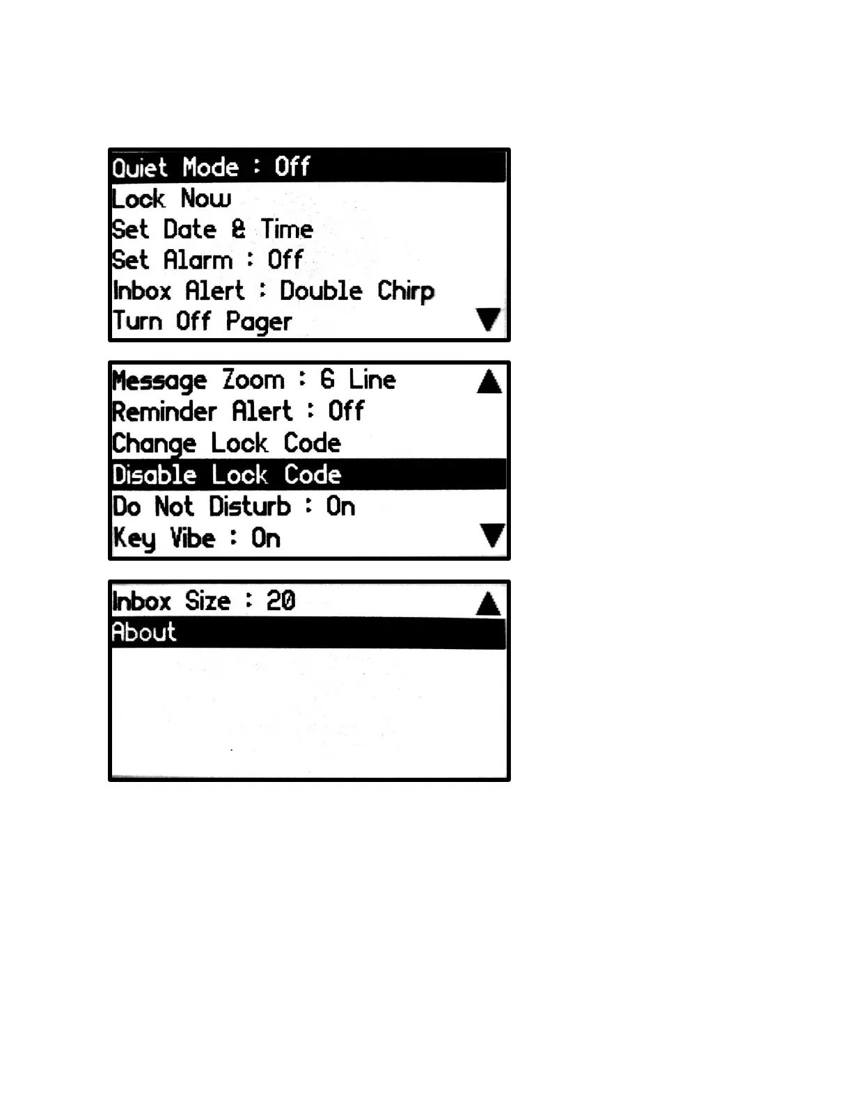 The Lock Now, Change Lock Code and Disable Lock Code items only appear if the Lock feature is enabled