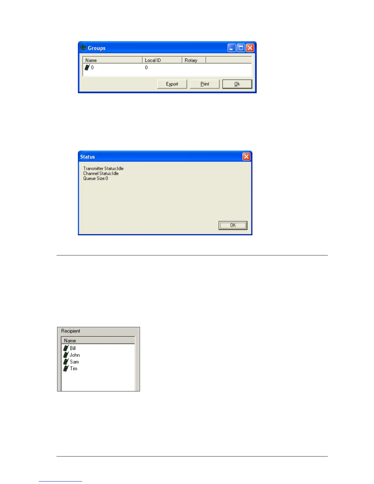 The Recipient window contains a list of the pagers and groups registered in the current database. At least one