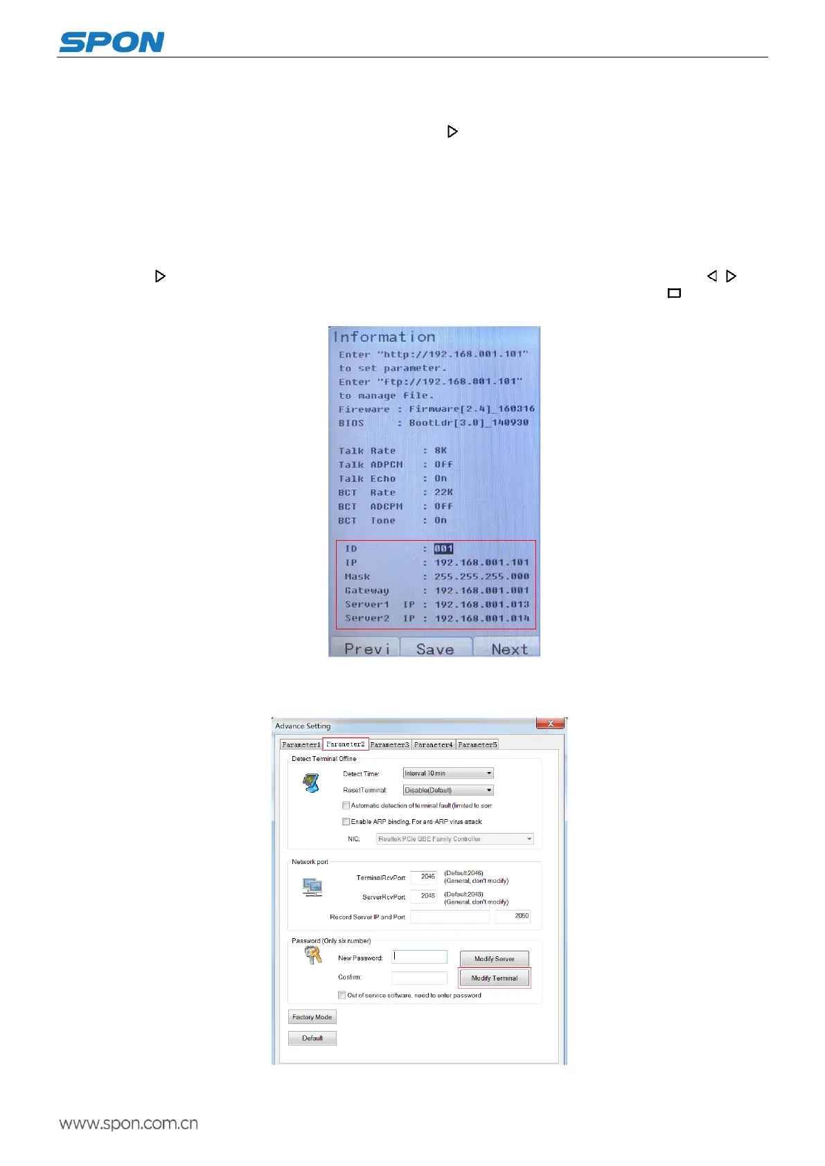 ④Information: Display terminal parameters information. Press “ ” or 【info】 key, enter password 【123456】and login