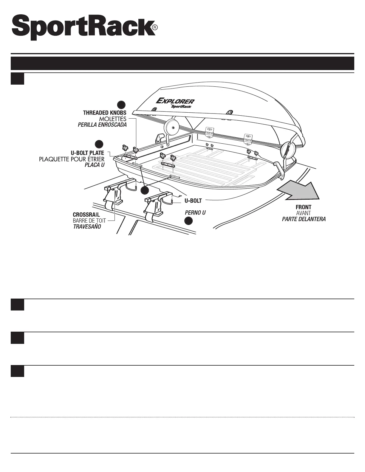 Una vez que el portaequipaje esté armado, póngalo sobre los travesaños, coloque los pernos U (H) bajo los travesaños, empuje los pernos U a través de los orificios de montaje de la base del portaequipaje y de las placas U (J). Fije con las perillas
