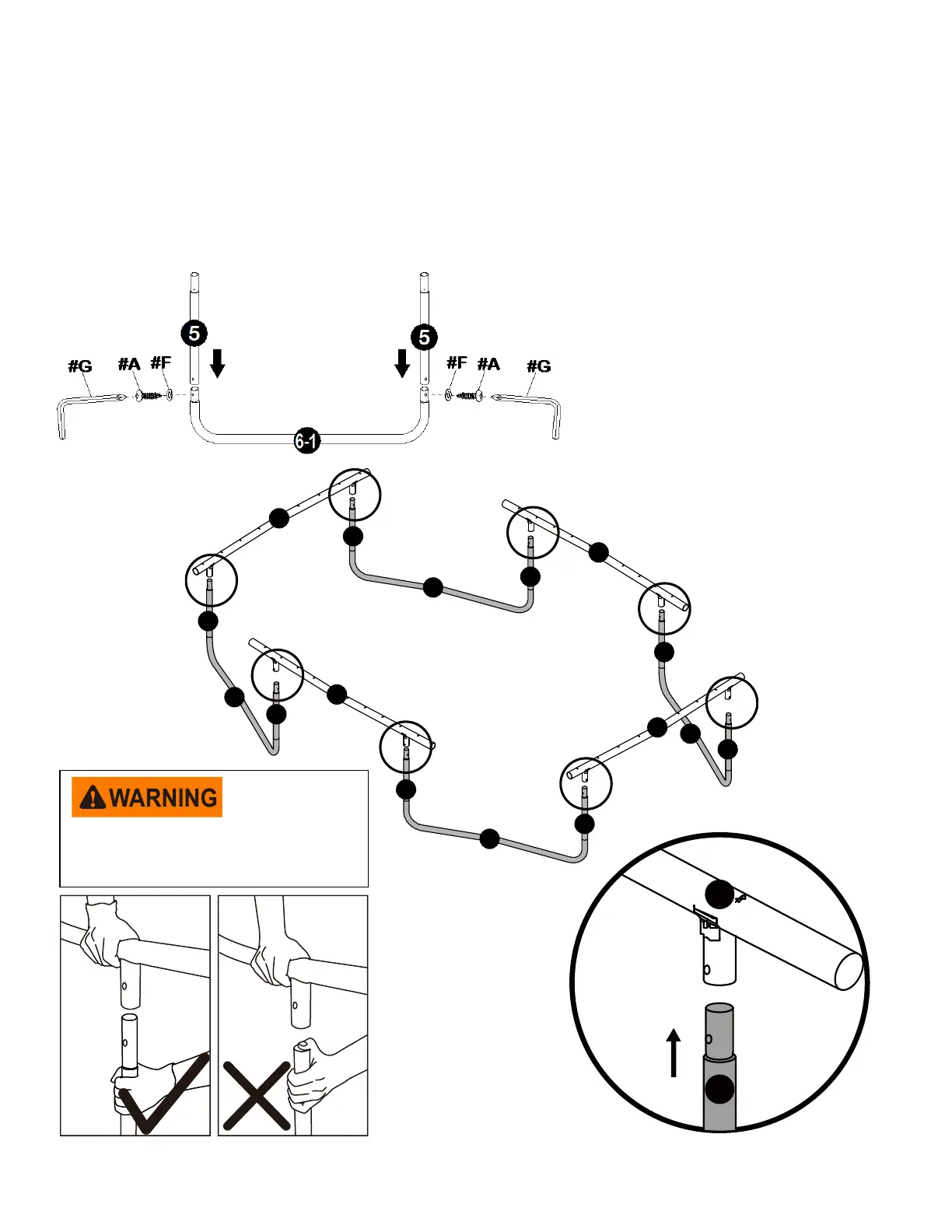 First assemble the leg pieces by connecting Part 5 to each side of Parts 6-1 and 6-2. DO NOT FULLY TIGHTEN