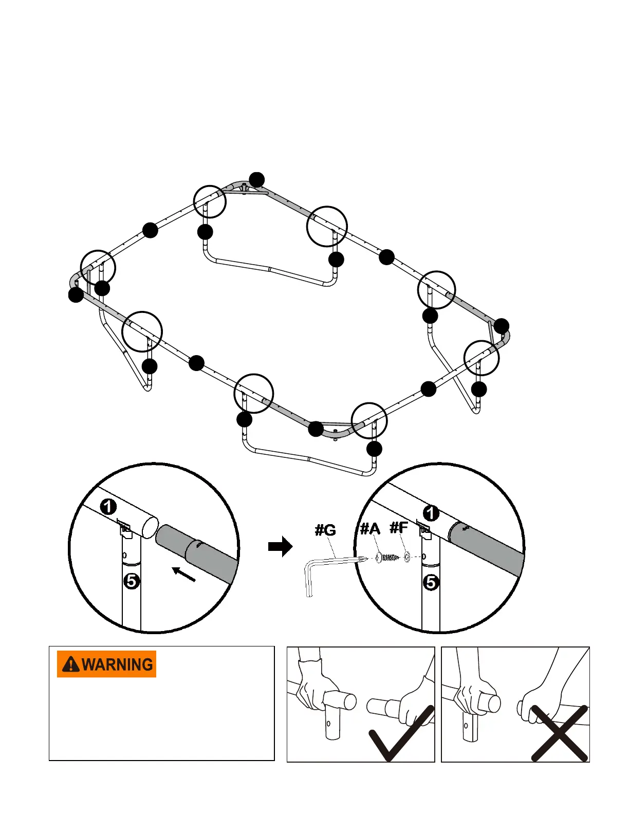 ONCE THE TRAMPOLINE FRAMES IS ASSEMBLED, FULLY TIGHTEN ALL THE SCREWS.