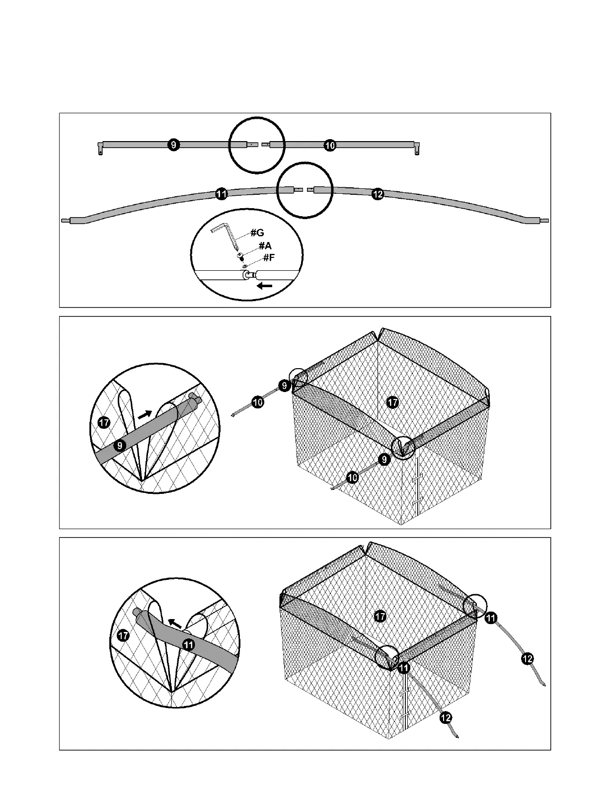 NOTE: Parts 9 and 10 go into the shorter side of the enclosure netting. Parts 11 and 12 go into the longer side.