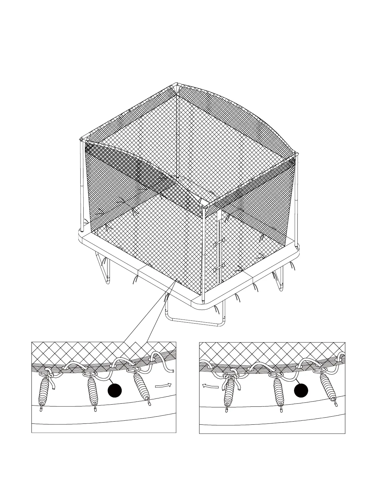 Use the cords (Part 19) to tie down the enclosure netting to the trampoline frame. Lift the frame pad and tie one end