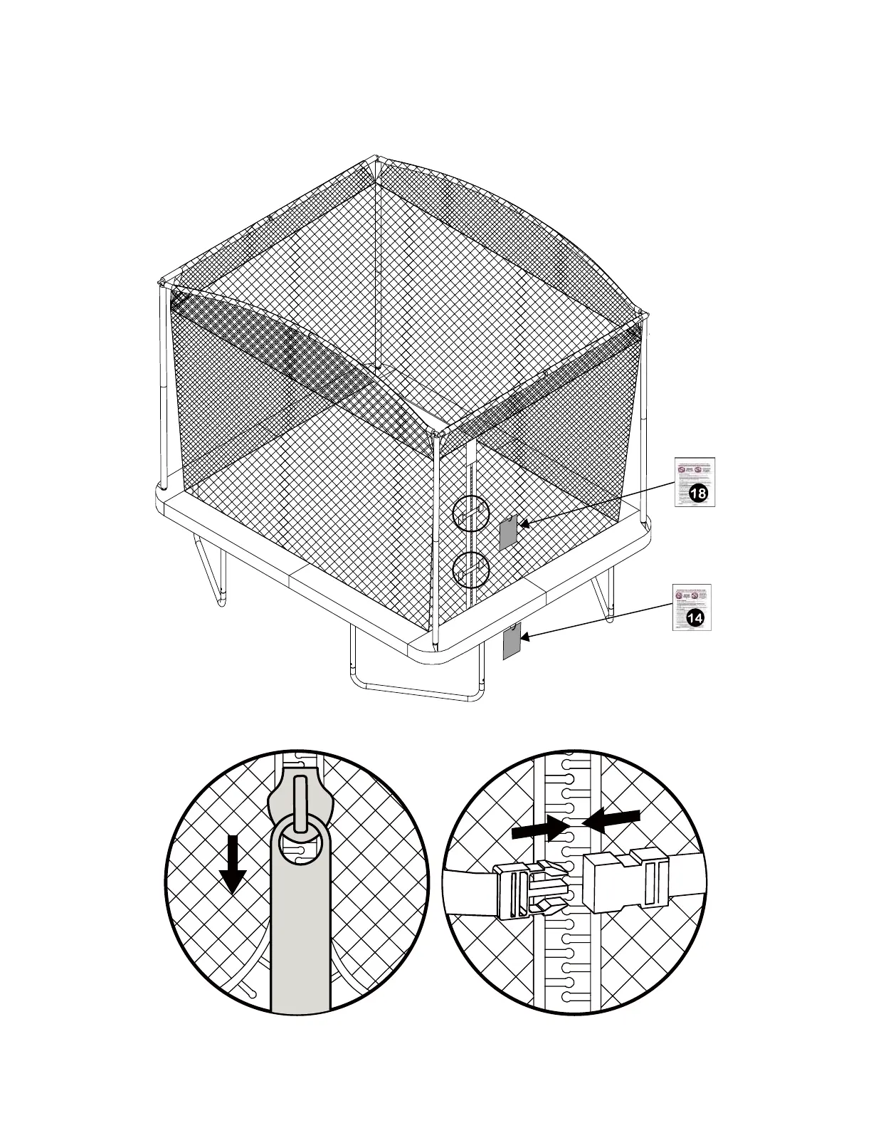 Pull the zipper all the way down and close the buckles during use of the trampoline.