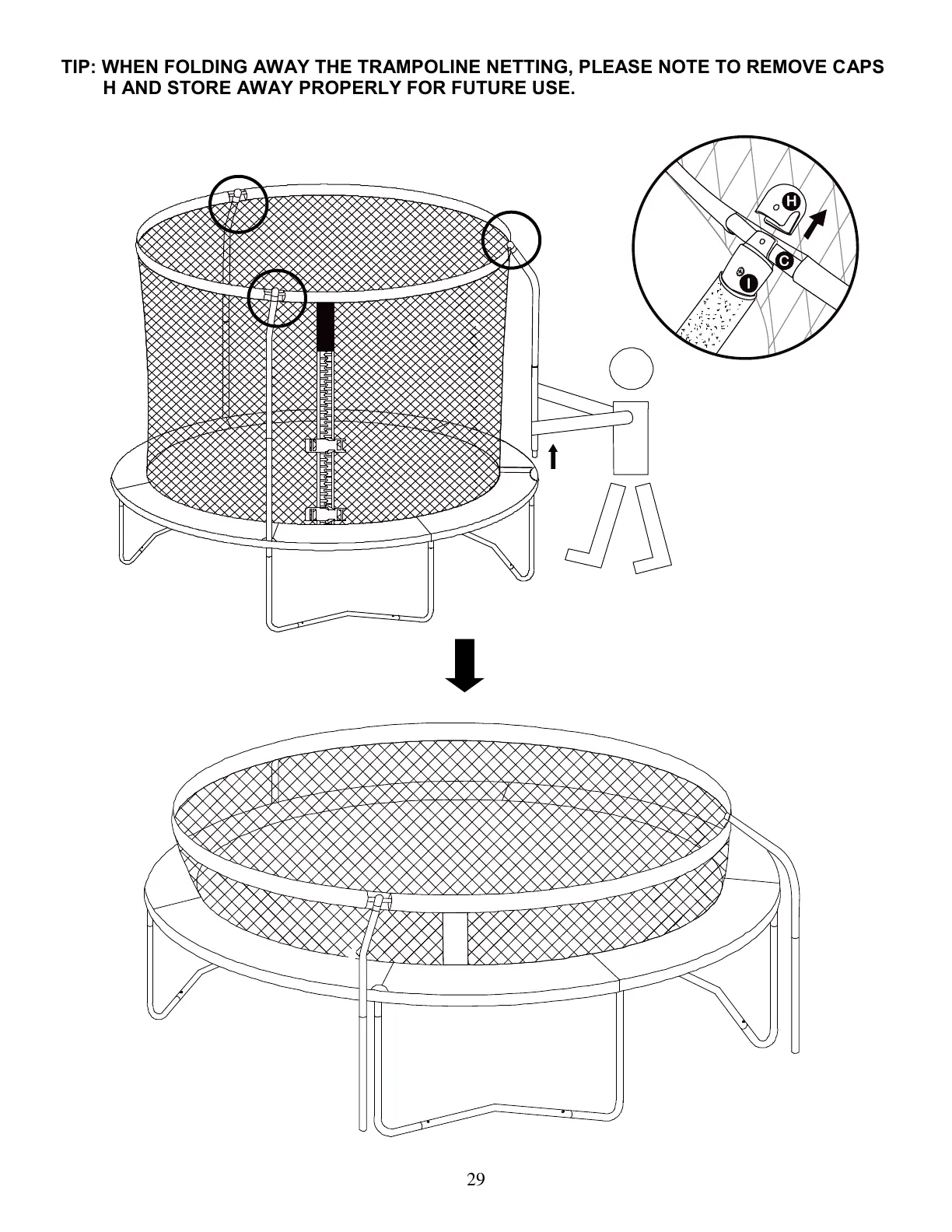 TIP: WHEN FOLDING AWAY THE TRAMPOLINE NETTING, PLEASE NOTE TO REMOVE CAPS