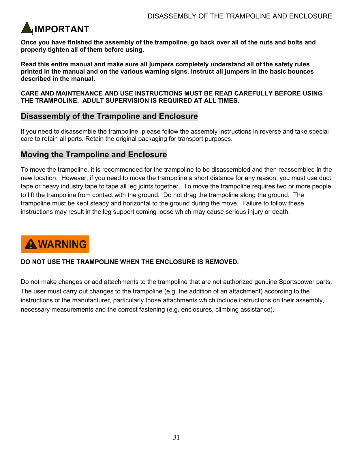 Do not make changes or add attachments to the trampoline that are not authorized genuine Sportspower parts.