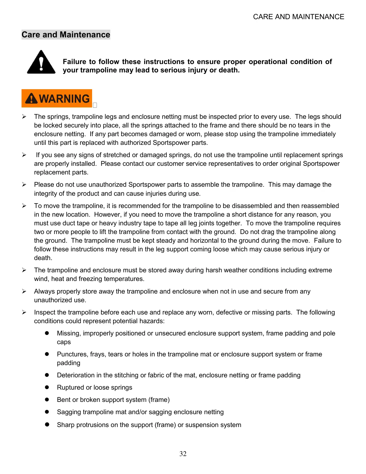 Inspect the trampoline before each use and replace any worn, defective or missing parts. The following