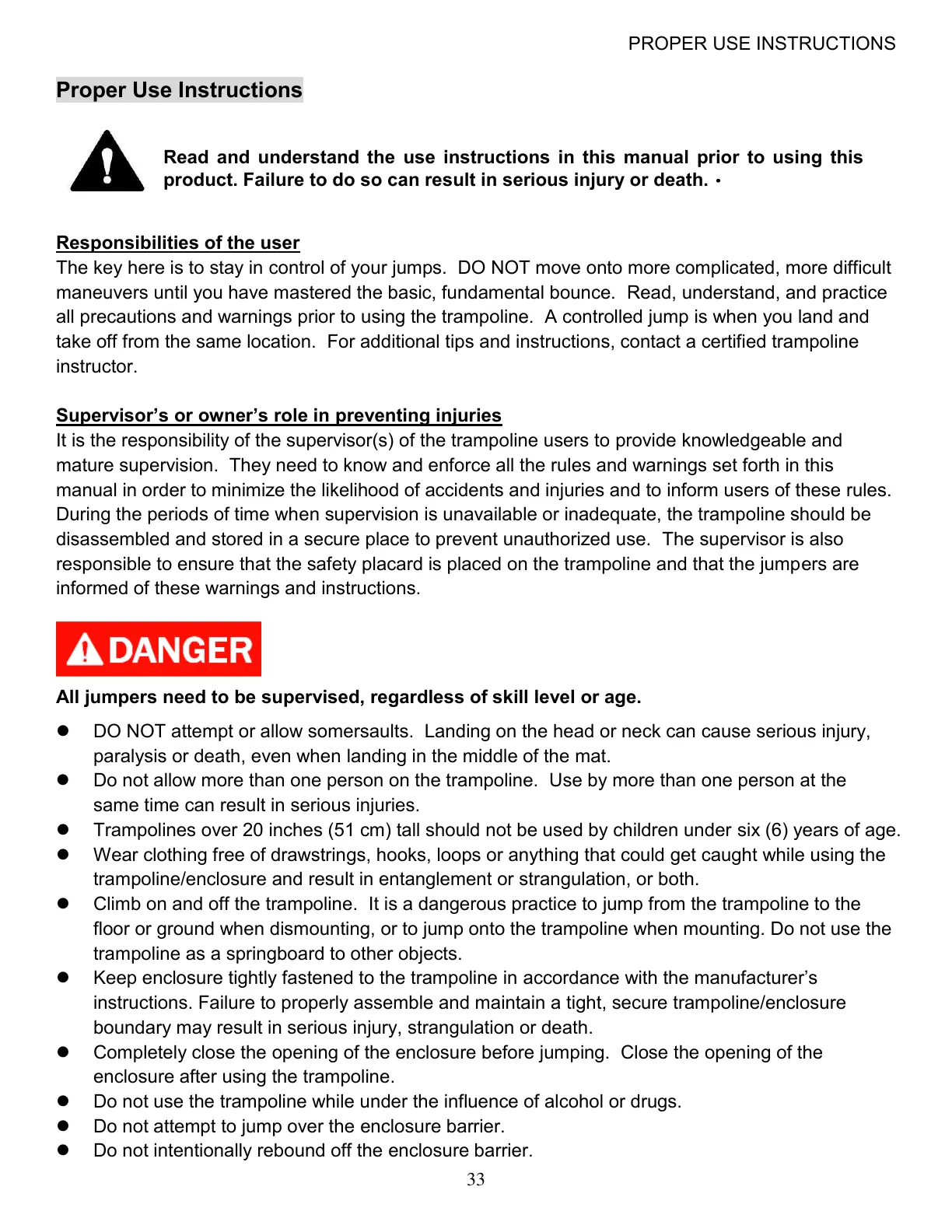 instructions. Failure to properly assemble and maintain a tight, secure trampoline/enclosure