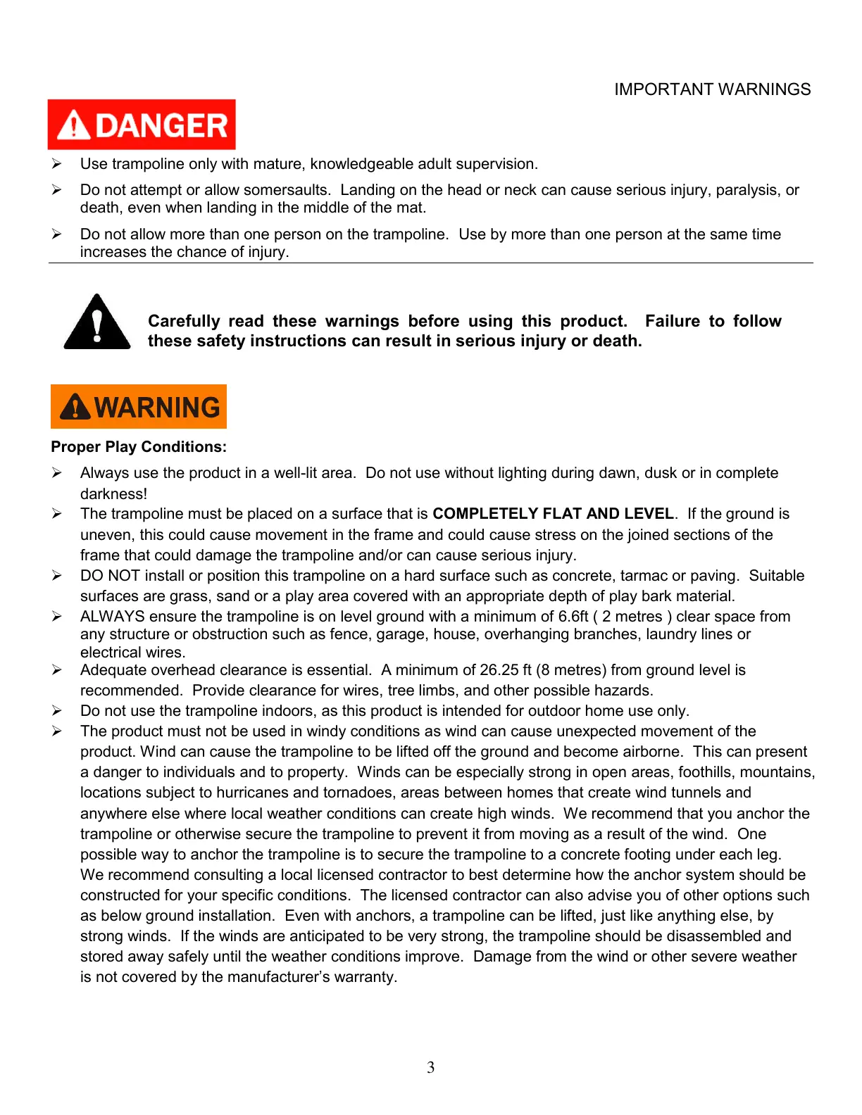 ALWAYS ensure the trampoline is on level ground with a minimum of 6.6ft ( 2 metres ) clear space from