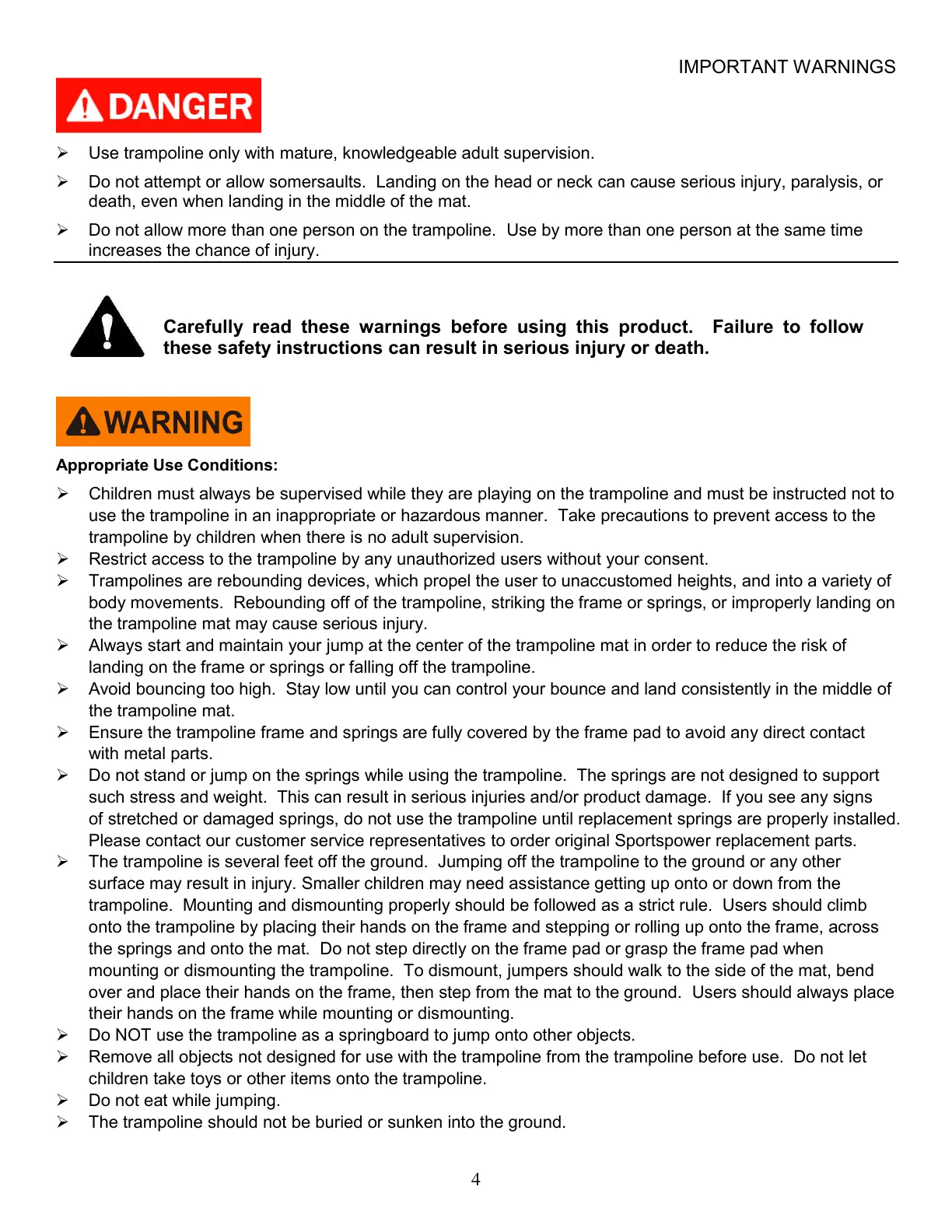 Do not attempt or allow somersaults. Landing on the head or neck can cause serious injury, paralysis, or