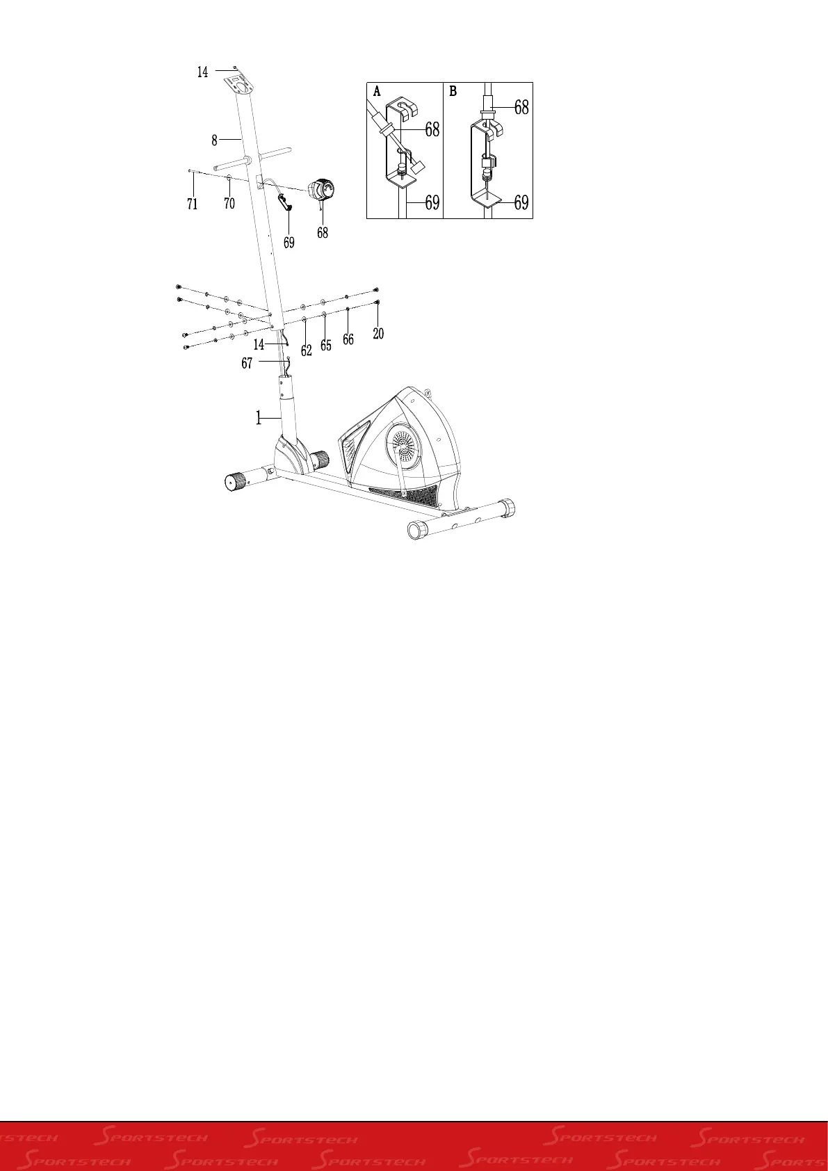 Inserire la postazione anteriore (8) sul tubo del telaio principale (1) e fissarlo con sei bulloni M8x15 (20), sei rondelle