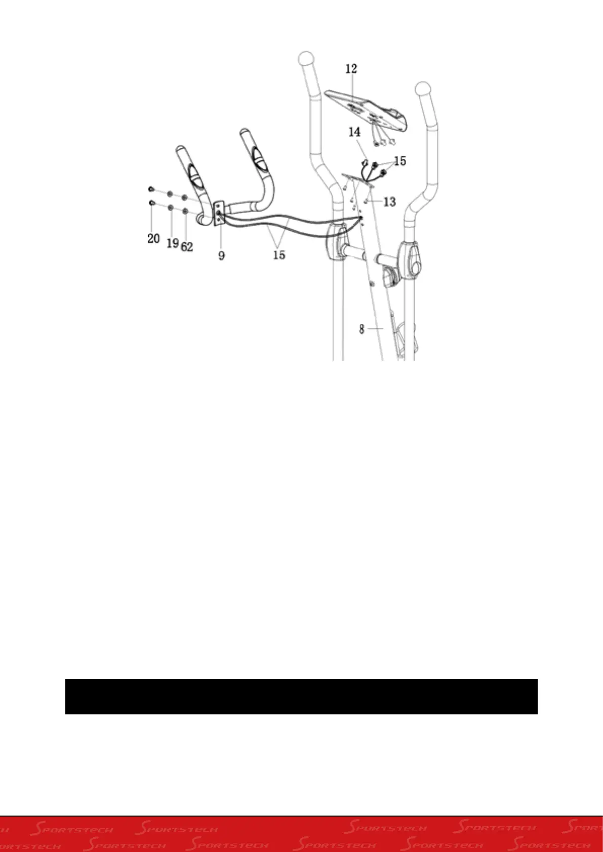 Fissare il manubrio (9) sulla postazione frontale (8) con due bulloni M8x15 (20), due rondelle in PVC (62)