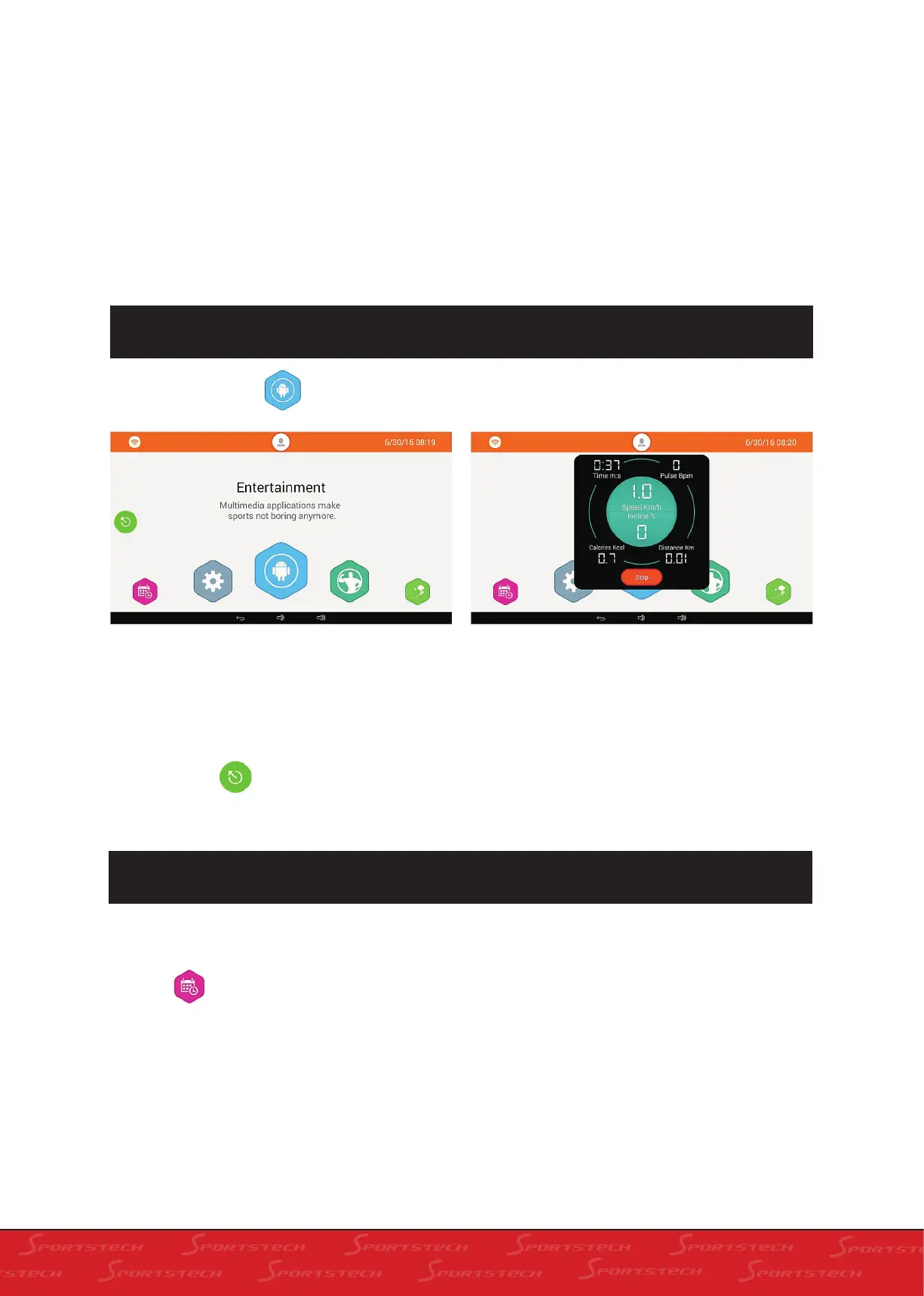 the screen. The three circles below show the accumulated time, distance and calorie. The percentage