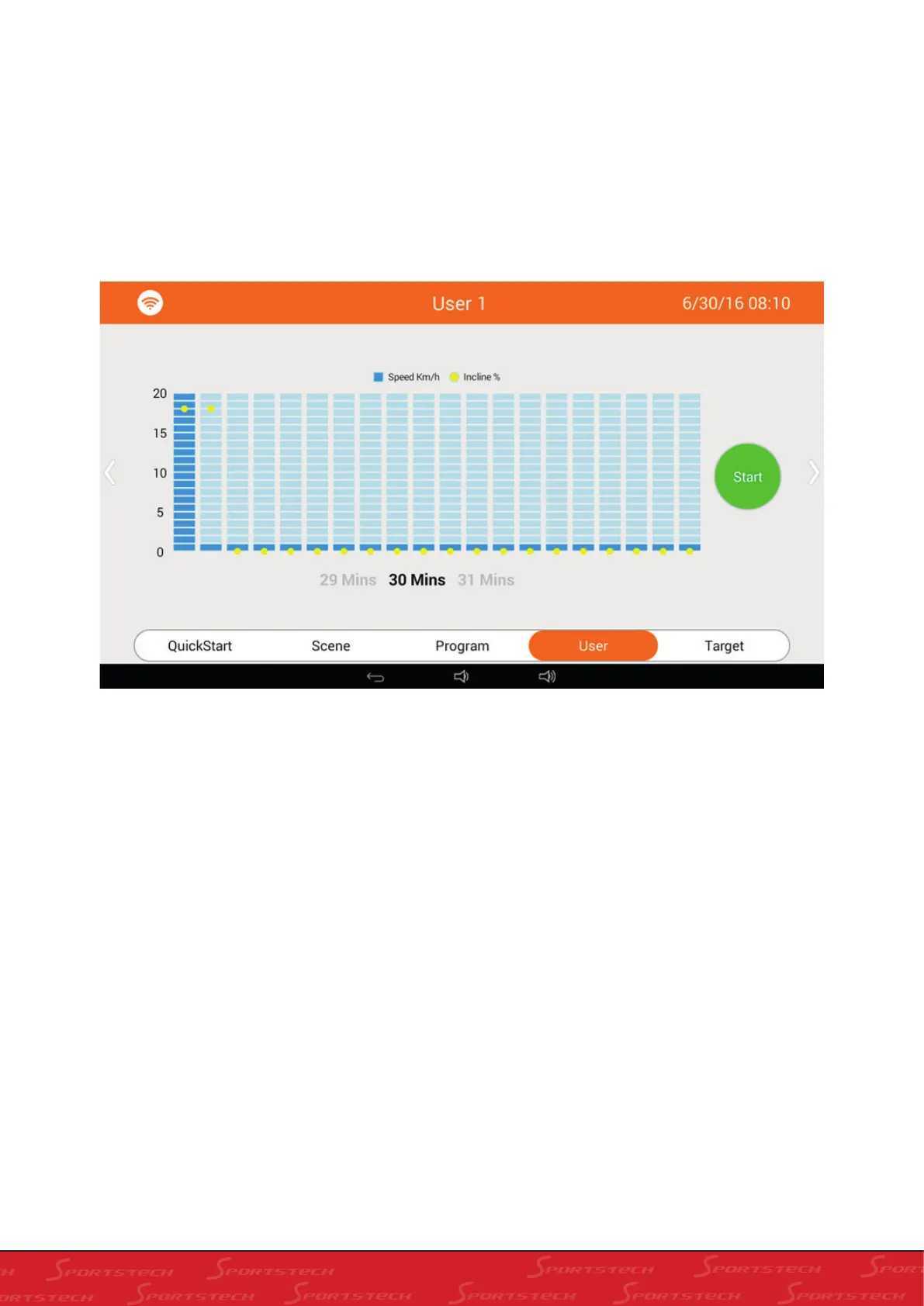3). Press Start to start treadmill motor, running of customised program as below