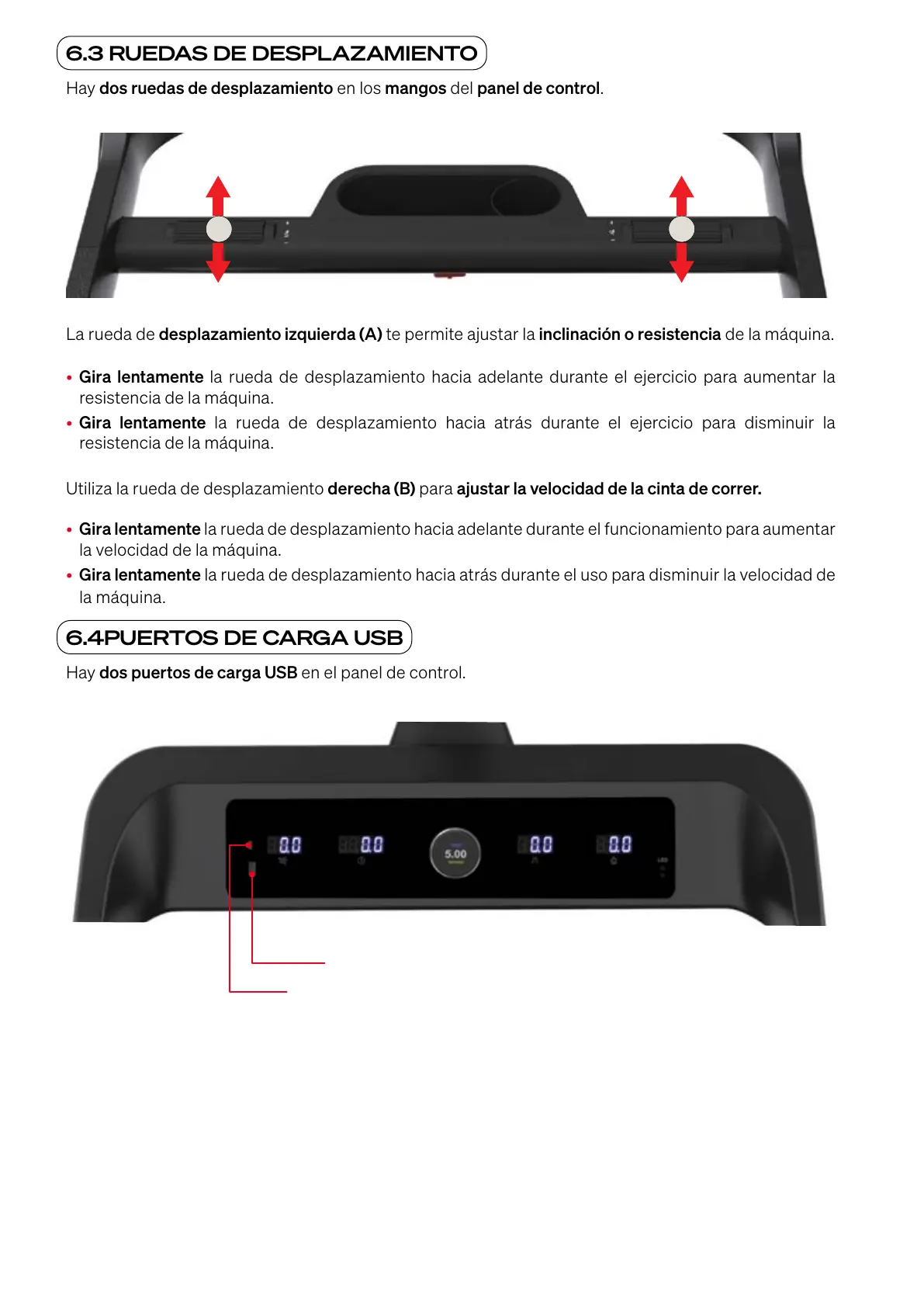 Utiliza la rueda de desplazamiento derecha (B) para ajustar la velocidad de la cinta de correr.