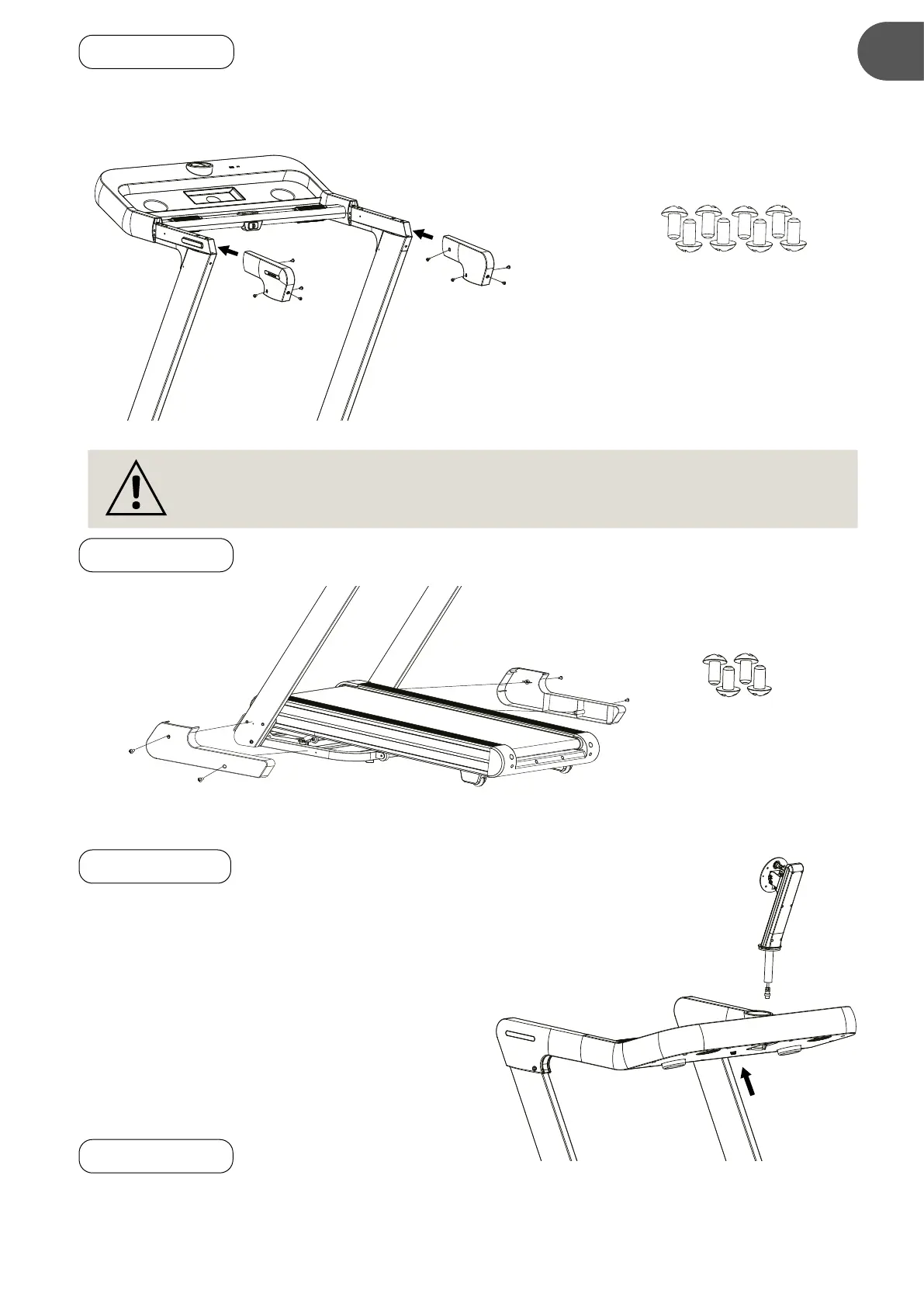 Fixez les deux couvercles de base droite/gauche (E) sur les tubes de support du guidon gauche/droit,