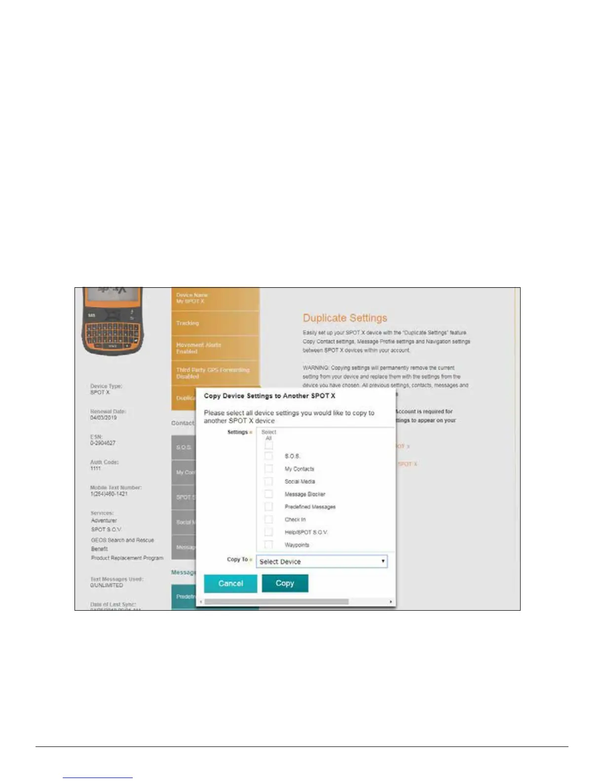 1. Select Copy Device Settings to Another SPOT X and the Copy Device Settings to Another SPOT X popup