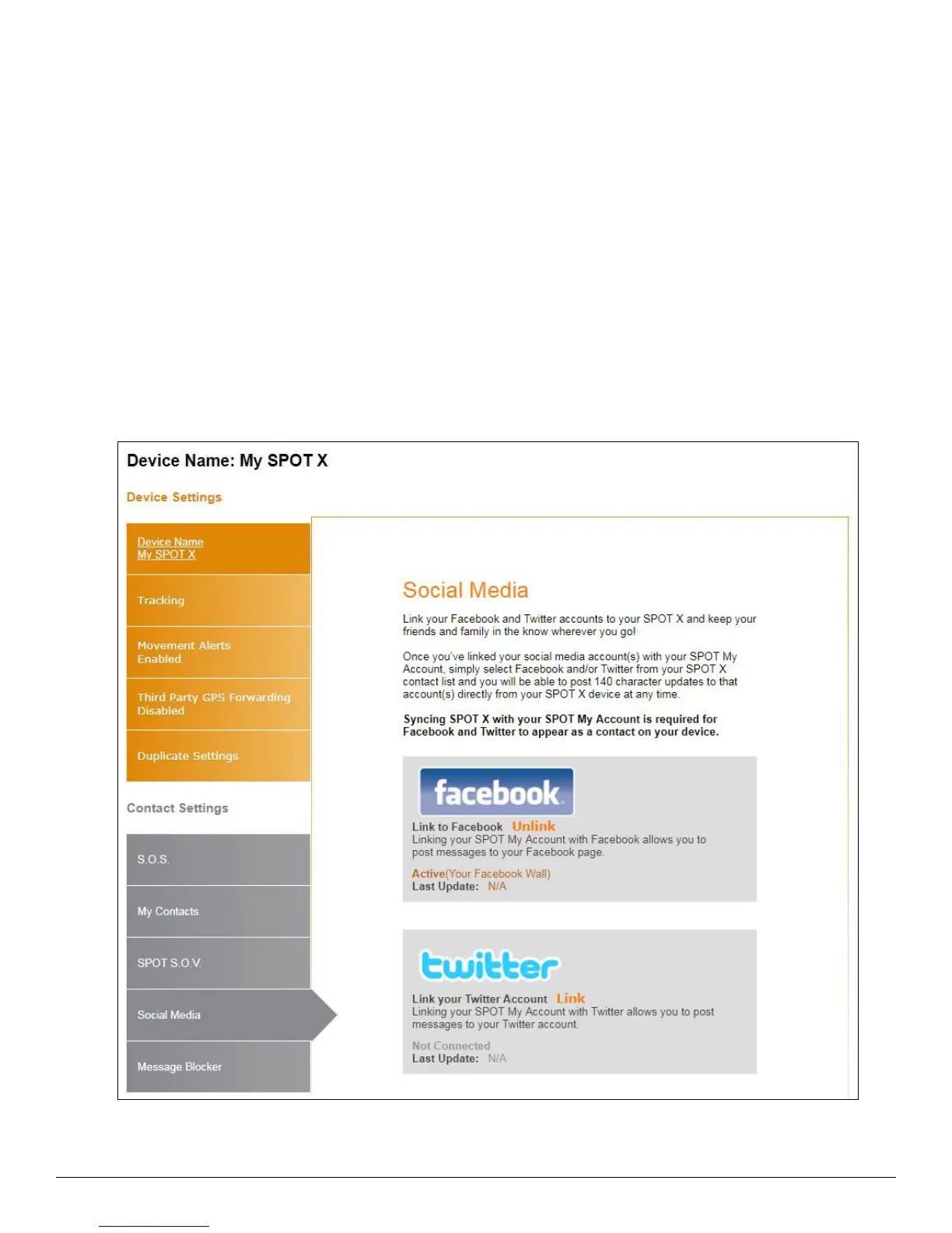 The Social Media tab is used to link your Facebook and Twitter accounts with the SPOT X. Once you’ve linked your