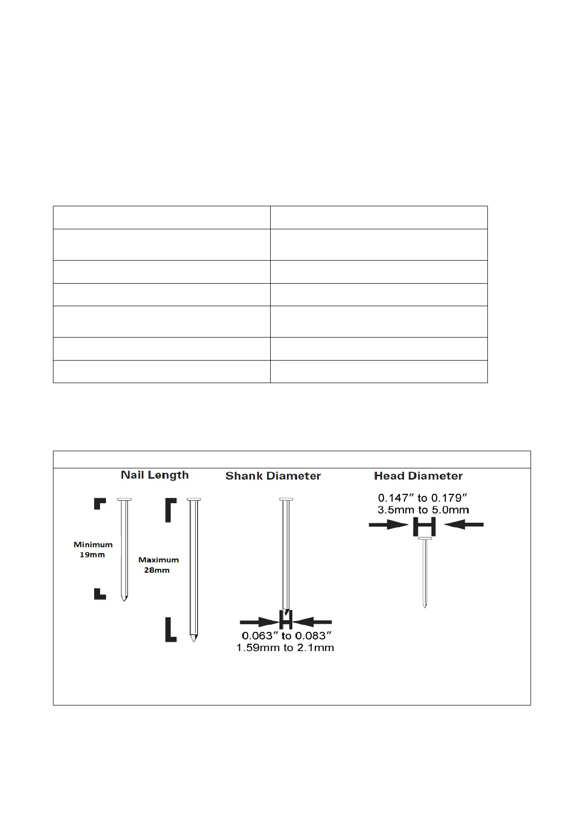Only the nail sizes shown in the table below can be driven with this nailer.