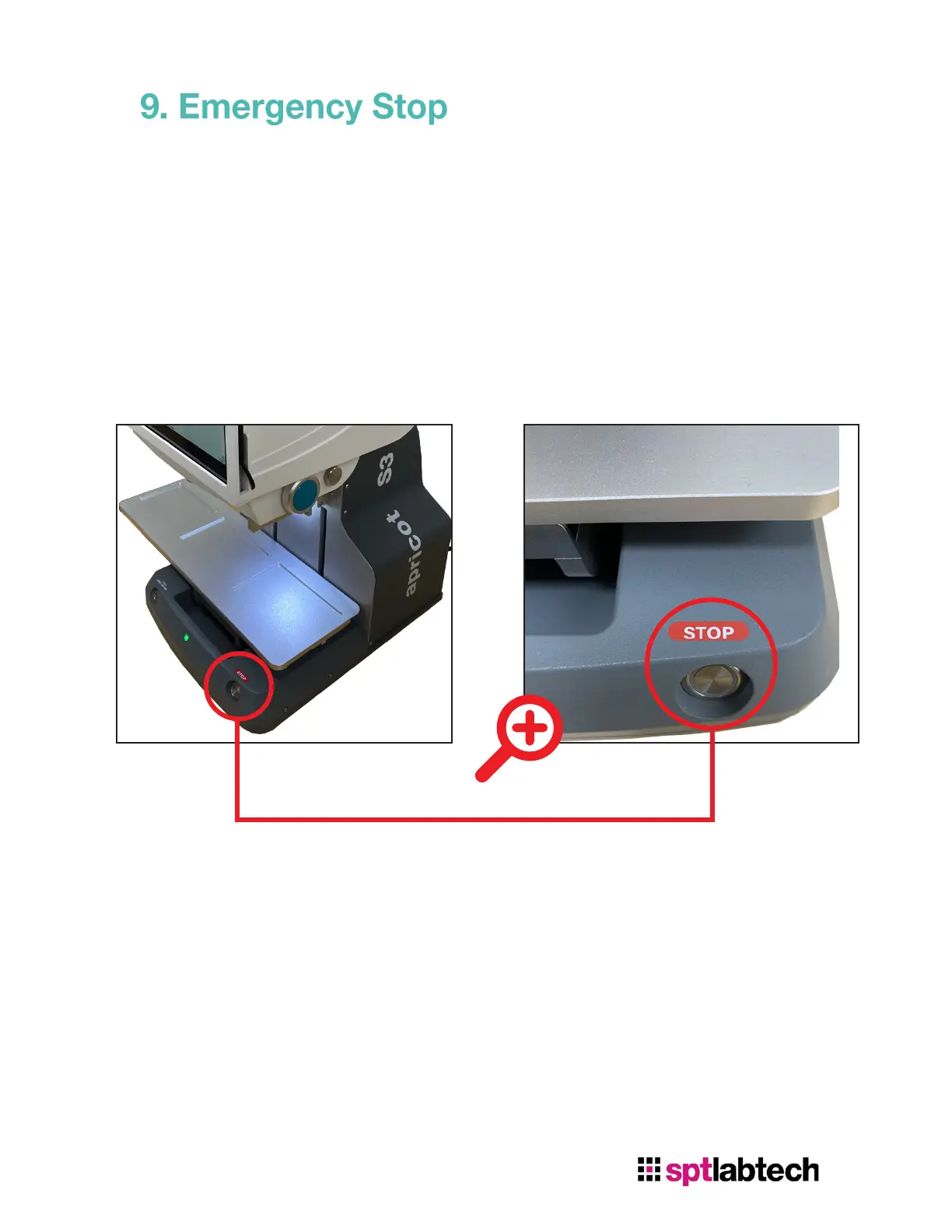 When pressed, the instrument will stop, and the Z-elevator will move down in case