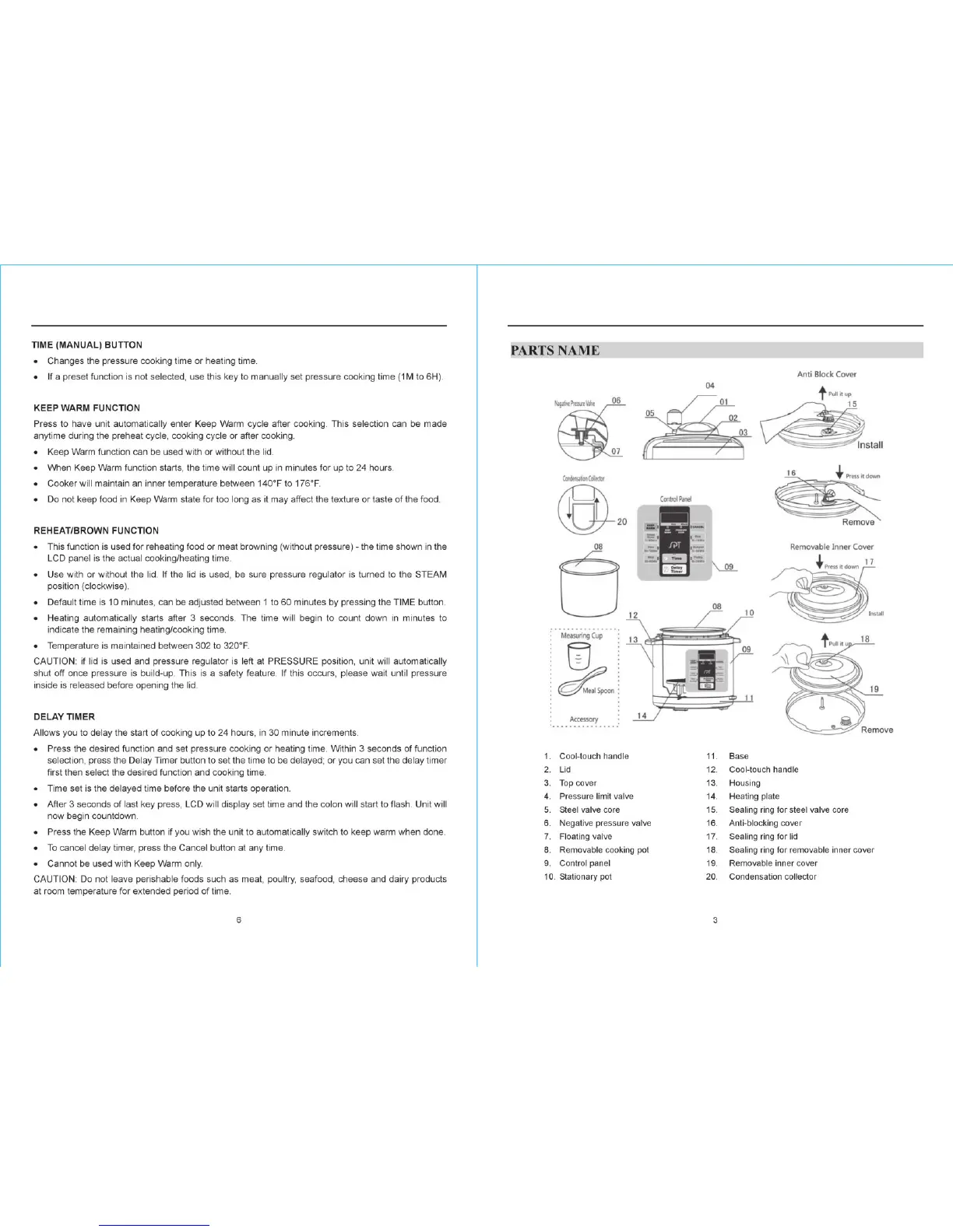 SPT EPC-11A - Parts Name; Time (Manual) Button; Keep Warm Function; Reheat;Brown Function