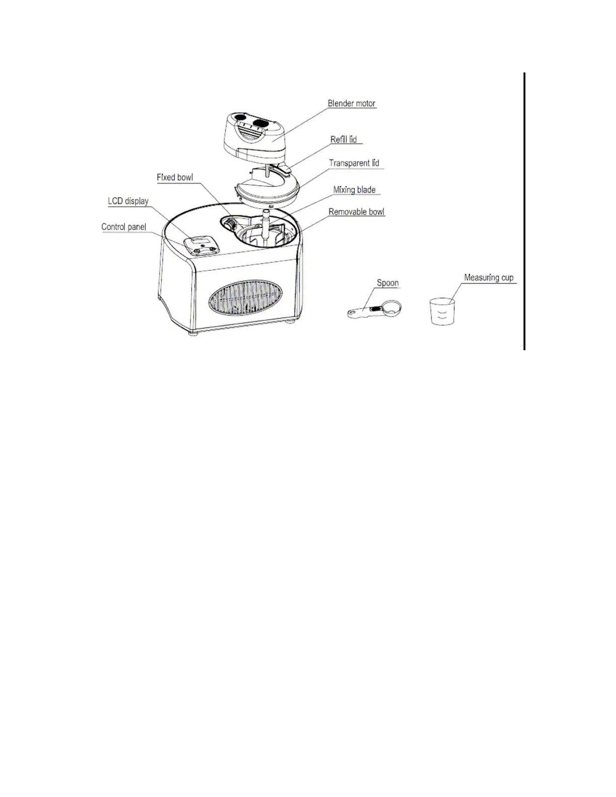 bowl, removable bowl, mixing blade, transparent lid, refill lid, measuring cup and spoon).