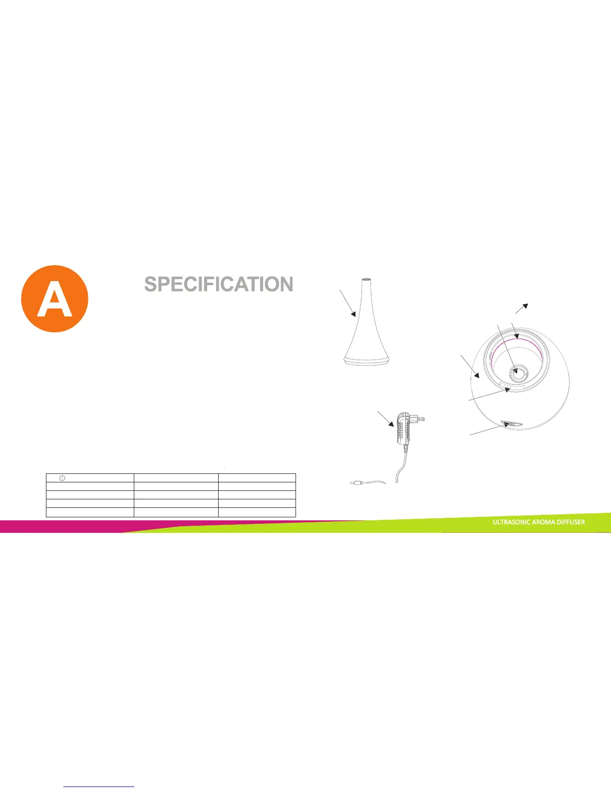 SPT SA-030 - SPECIFICATION; A. Cover; B. Base (water tank); C. Power Adapter