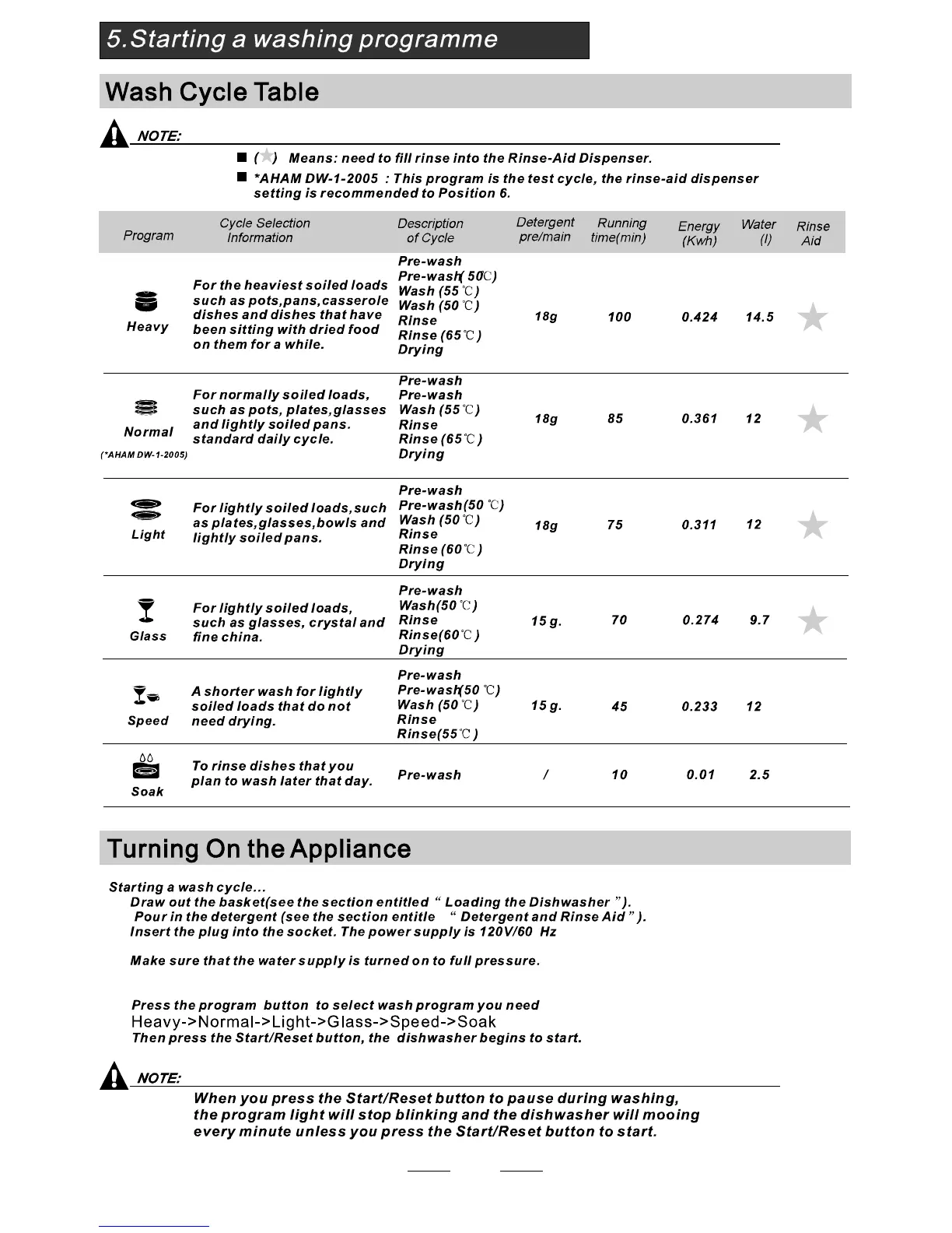 SPT SD-2201S - Starting a Washing Programme; Wash Cycle Table Overview; Appliance Operation Steps