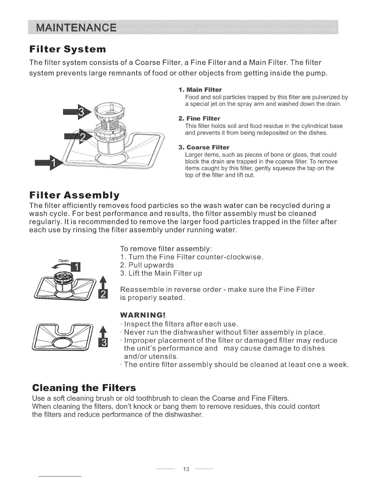 Never run the dishwasher without filter assembly in place.
