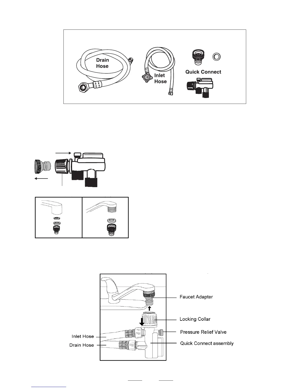 Quick Connect, Drain and Inlet Hose. The faucet adapter must be installed on the