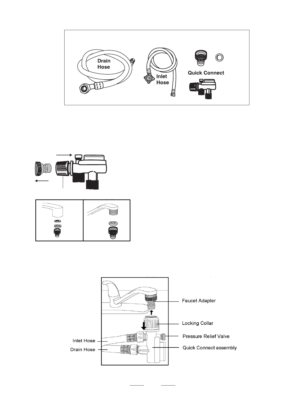 Quick Connect, Drain and Inlet Hose. The faucet adapter must be installed on the