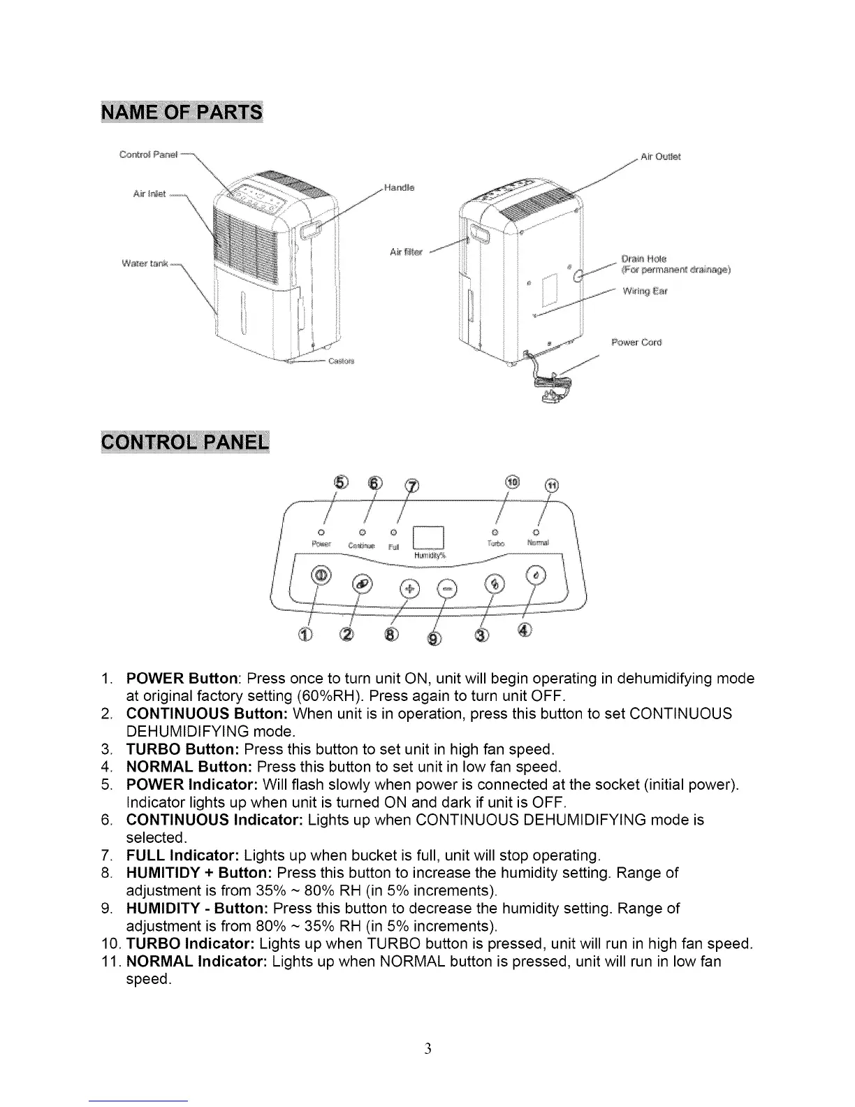 1. POWER Button: Press once to turn unit ON, unit will begin operating in dehumidifying mode
