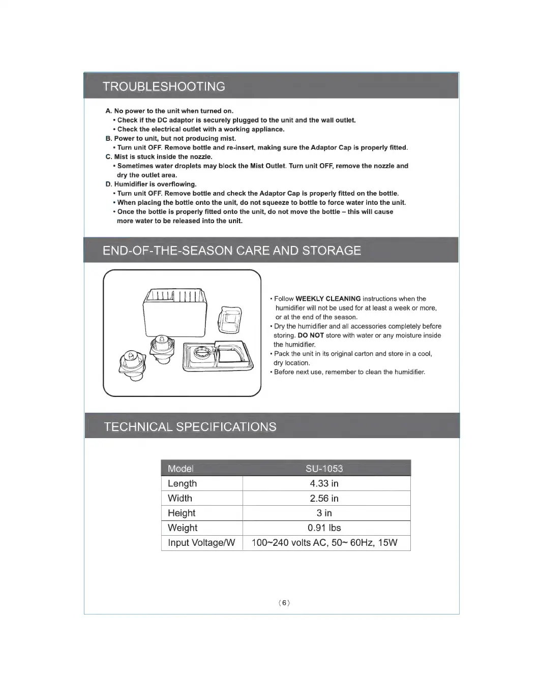 SPT SU-1053 - Troubleshooting; Common Troubleshooting Issues; End-of-the-Season Care and Storage; Technical Specifications
