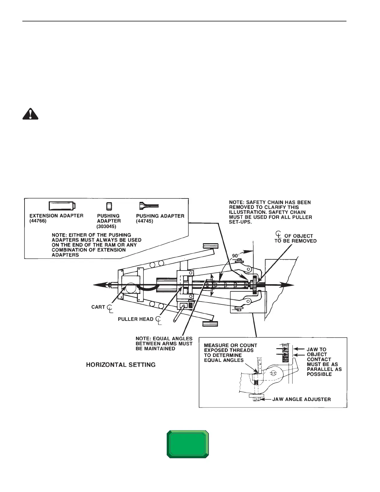 removed must be at a 90° angle to the flat surface of the jaws and on the same centerline as the puller cart and