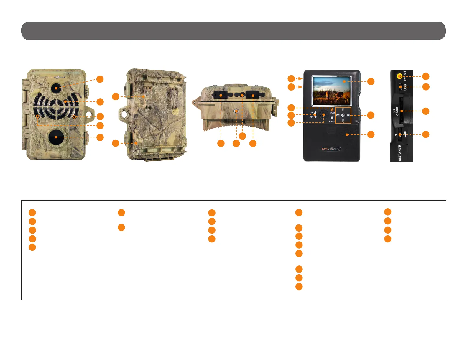 Spypoint BF-10HD - Camera Components Overview; Optical and Detection Components; Power and Connectivity Ports; User Interface and Controls