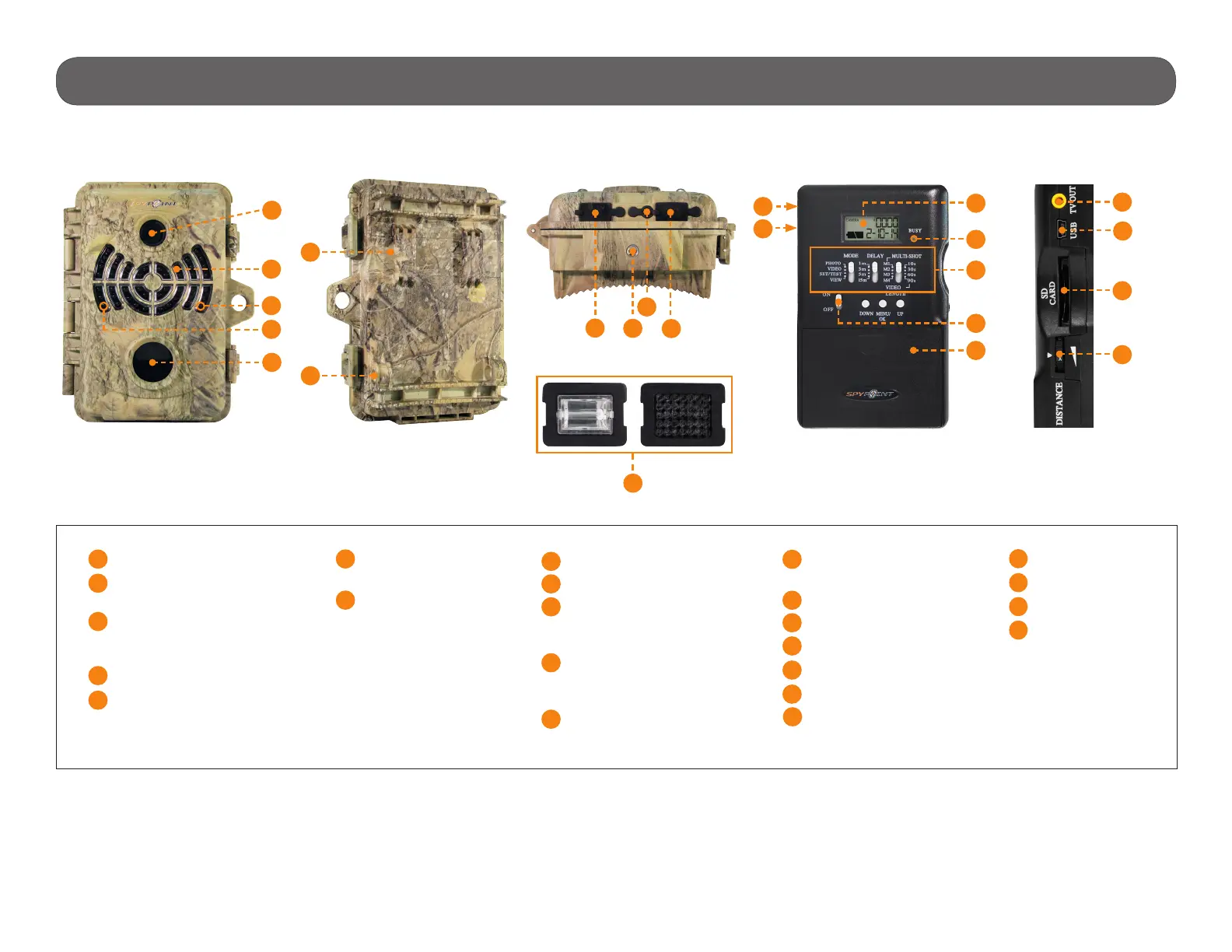 Spypoint BF-8 - Camera Components Overview; Lens and Light Sensors; Mounting and Security Features; Power and Control Interfaces