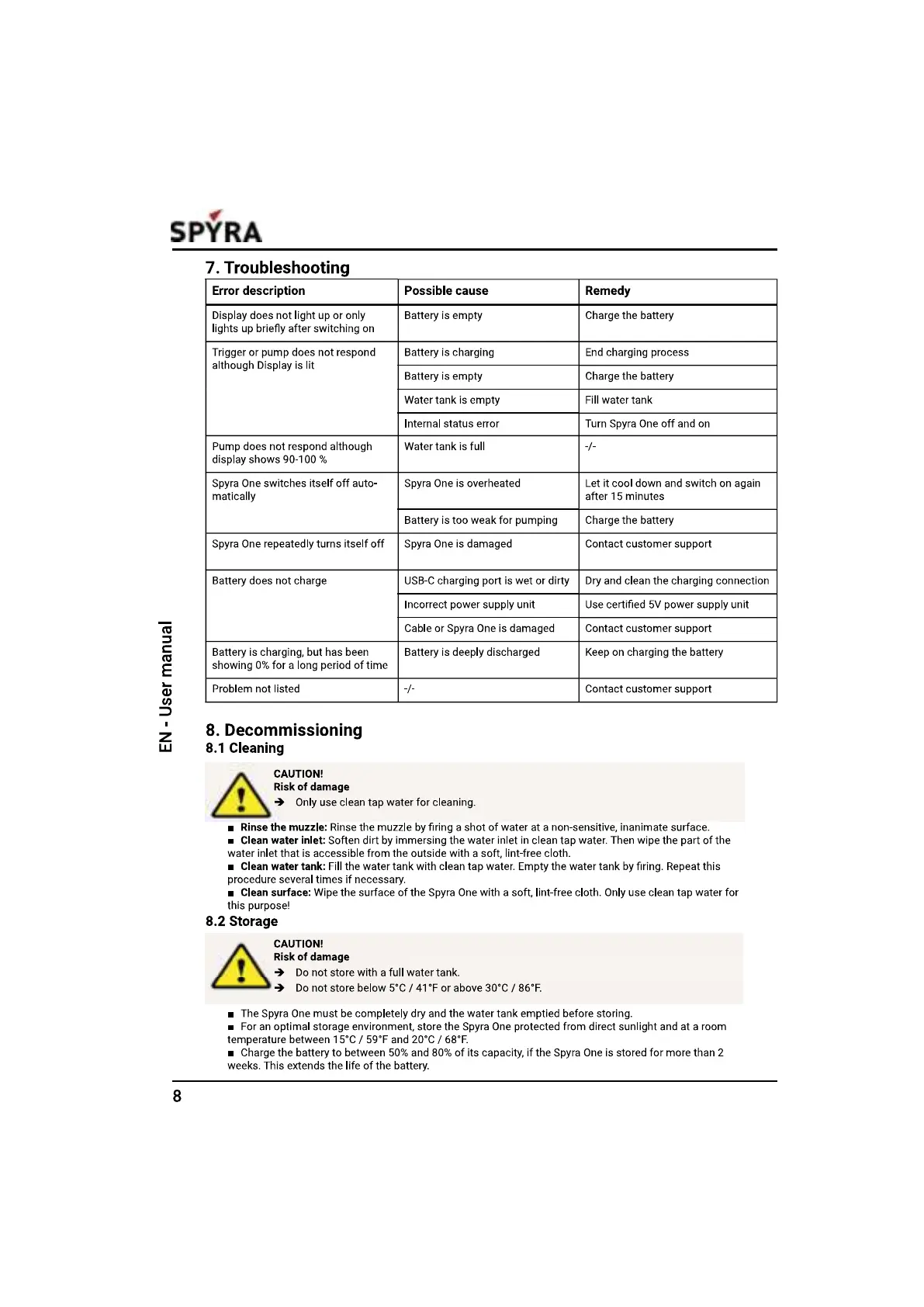 SPYRA One - Support and Maintenance; Troubleshooting and Cleaning; Storage Recommendations