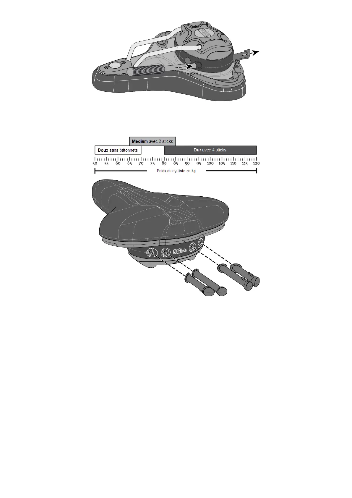 Conservez bien les sticks au cas où vous souhaiteriez utiliser à nouveau la selle avec les sticks d'amortissement à une date ultérieure.